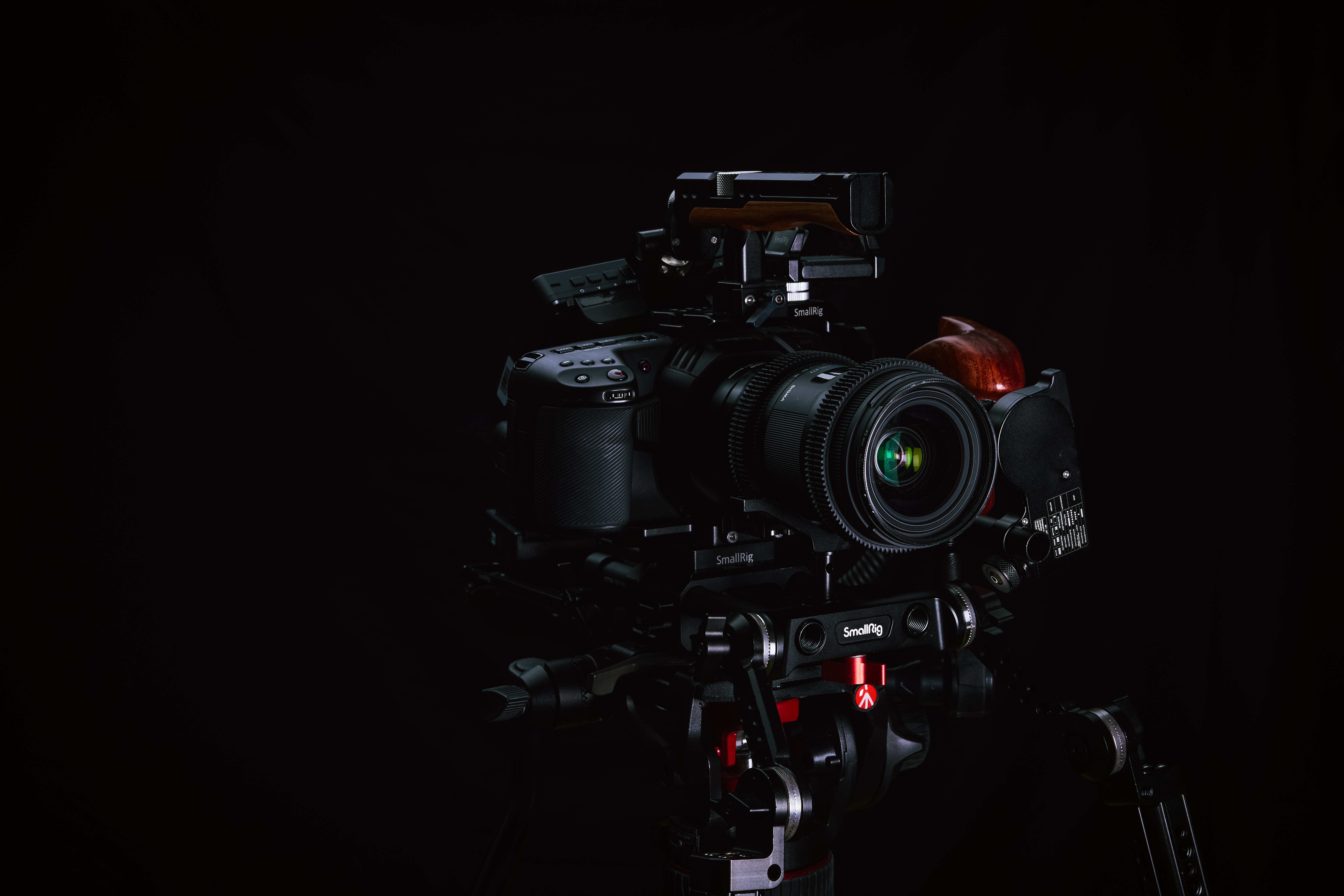 リグ付きの一眼レフカメラの写真素材です。黒いボディの一眼レフカメラにSmallRigの赤いカメラリグが装着され、三脚に固定されている状態で、カメラアクセサリーの詳細が確認できるように撮影されています。映像制作や写真撮影の機材紹介、カメラアクセサリーの商品撮影、機材の販売ページなどにおすすめです。