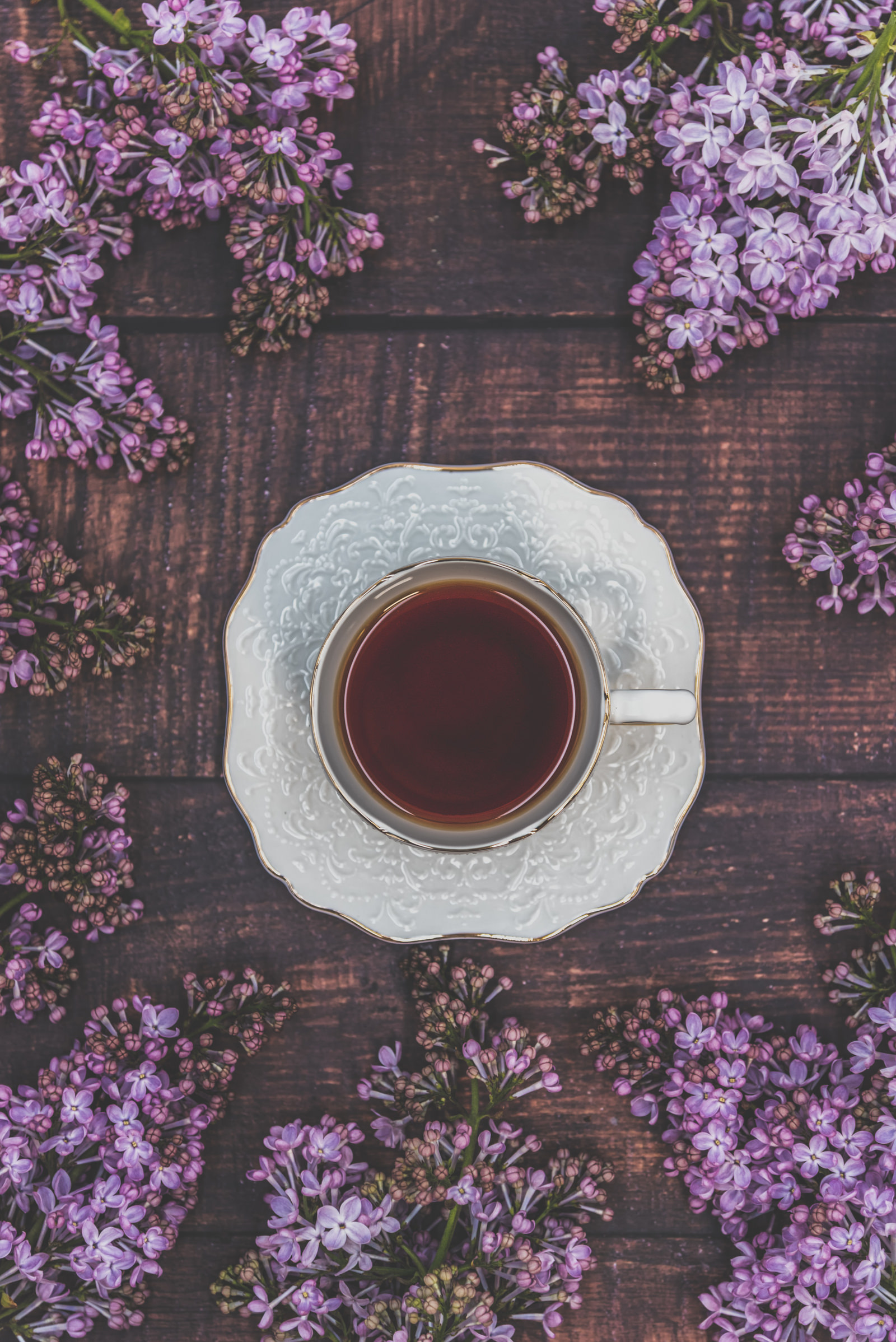 ライラックの花に囲まれたティーカップと紅茶の写真素材です。木製のテーブルに置かれた白いカップには温かな紅茶が注がれ、周囲を淡い紫色のライラックの花が散らされています。カフェやティータイムをテーマにしたWebサイト、リラックス系のブログ記事などに最適です。