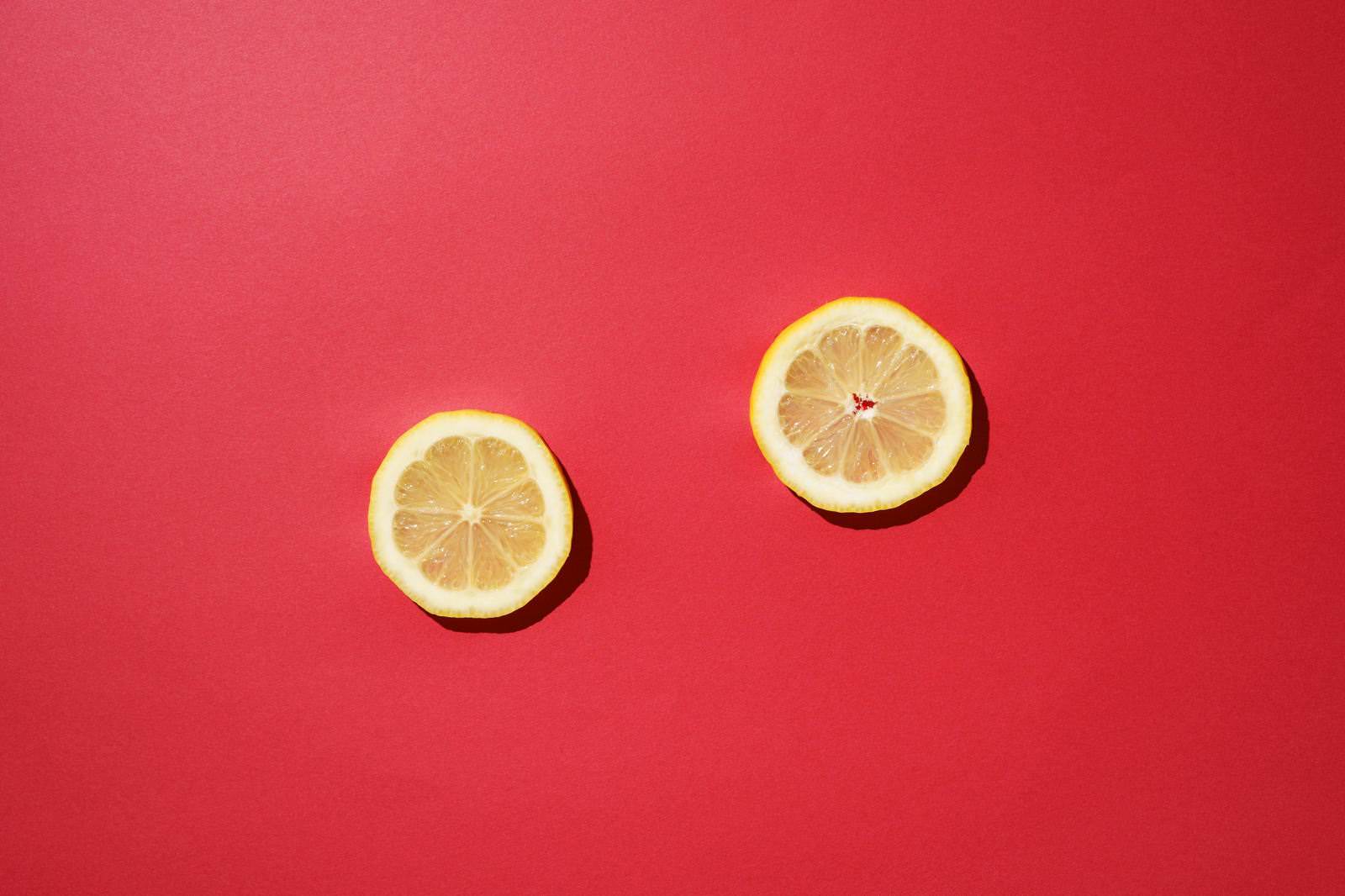 赤い背景にレモンの輪切りを配置した写真素材です。鮮やかな黄色のレモンスライスが2個並べられ、柑橘類の爽やかさと赤色の対比が印象的な構図。飲食店のメニュー制作やレシピサイト、健康食材をテーマにしたWebコンテンツなどにおすすめです。