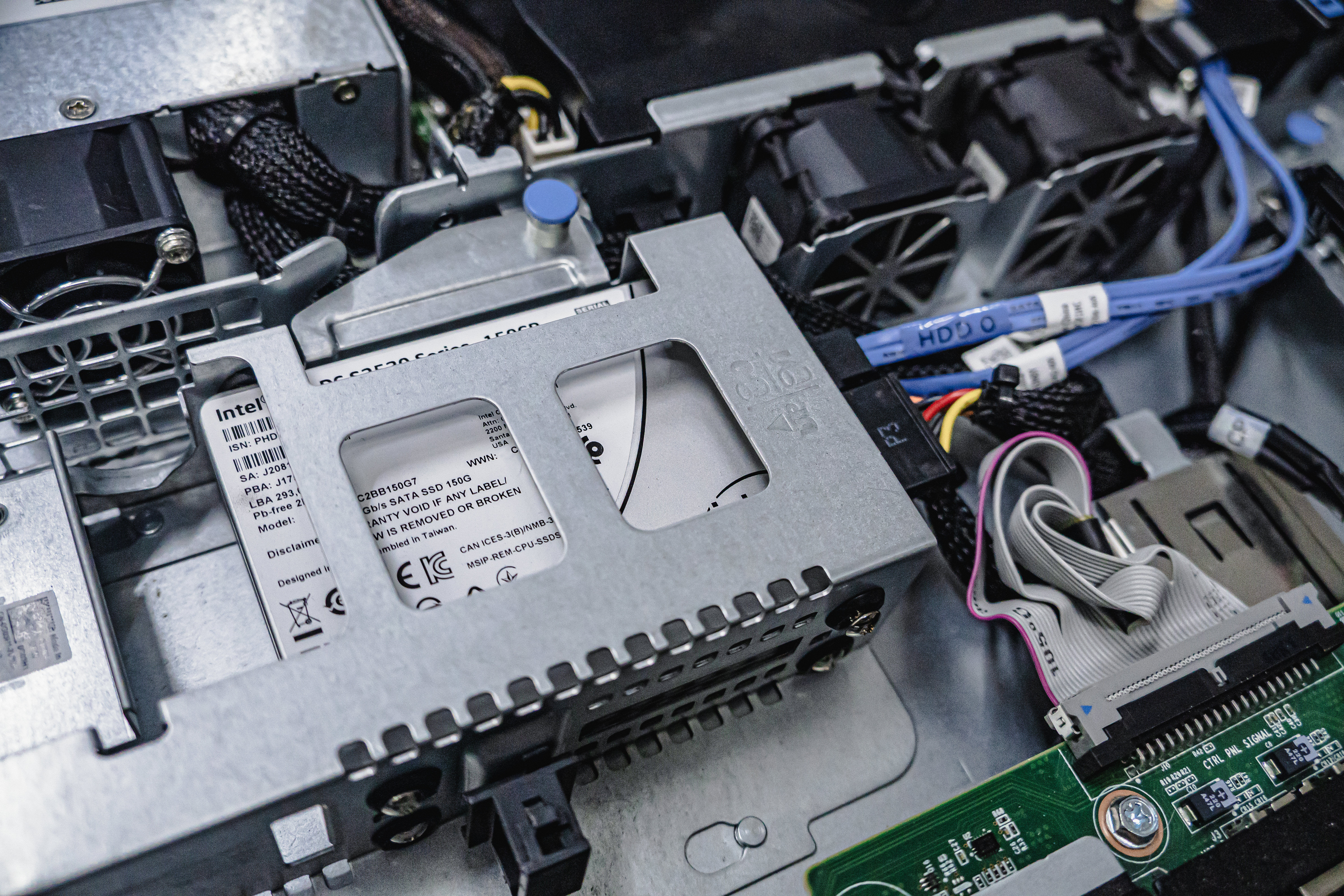 Intel製SSDを搭載したDELLサーバの写真素材です。サーバー内部でSSDがマウントされており、ケーブル類や他の精密機器が配置された複雑な構成が見えています、サーバーのストレージ構成やハードウェア構造の理解に役立ちます。IT関連の記事やサーバー保守、機器交換の解説などにおすすめです。