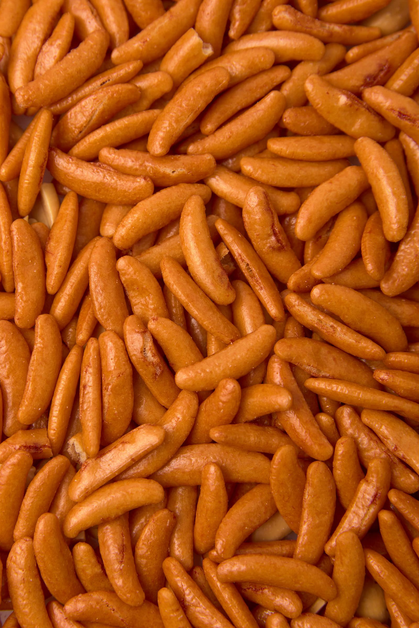 一面に敷き詰められた柿の種の写真素材です。オレンジ色の米菓が隙間なくびっしりと並んでおり、三日月形の特徴的な形状が鮮明に見えます。塩辛い風味の米菓は、食品パッケージデザインやスナック菓子の広告、つまみ関連のコンテンツなどにおすすめです。