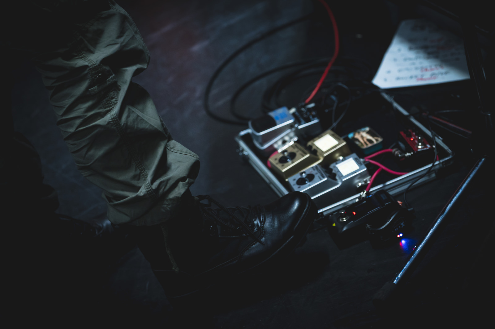 ライブステージの足元に置かれた複数のエフェクターペダルの写真素材です。暗い舞台空間に配置されたエフェクターに青い光が当たり、ギタリストの演奏を支える機材が照らされています。ライブ演奏や音楽制作、バンド関連のコンテンツ制作などにおすすめです。