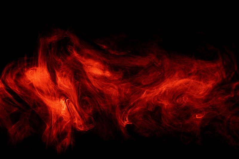 赤い炎のような歪んだ煙の写真素材です。黒い背景に立ち上る赤橙色の煙が渦巻くように歪み、燃え上がるような炎の形状をしており、呪いや怨念、恐怖の雰囲気を表現できます。ホラー系デザインやハロウィン関連、怖い雰囲気の制作などにおすすめです。