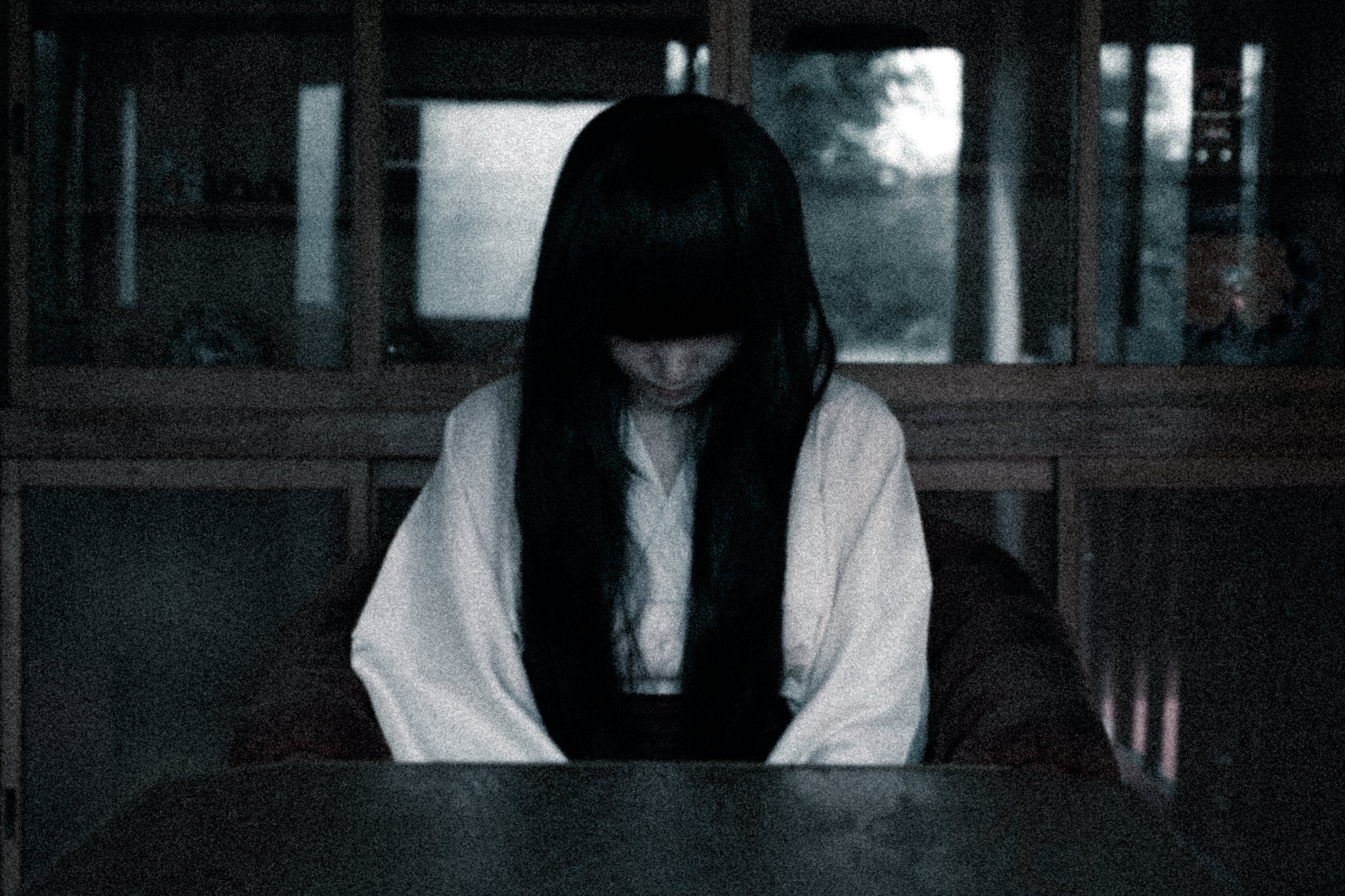 白装束を着た女性が俯いている写真素材です。暗い室内の椅子に座り、長い黒髪で顔を隠すように下を向いており、心理的な緊張と重圧が表れた構図となっています。ホラー系のWebサイトやブログ記事、心理的な負荷を視覚化したいデザイン素材などにおすすめです。