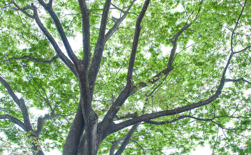空へ伸びる新緑の枝ぶりの写真素材です。青空を背景に、太い幹から放射状に広がる枝に鮮やかな緑の葉が茂り、春の時季に樹木が生長する姿をとらえた一枚。力強い枝ぶりが特徴的で、自然をテーマとしたデザインやエコロジー関連のコンテンツ制作などにおすすめです。