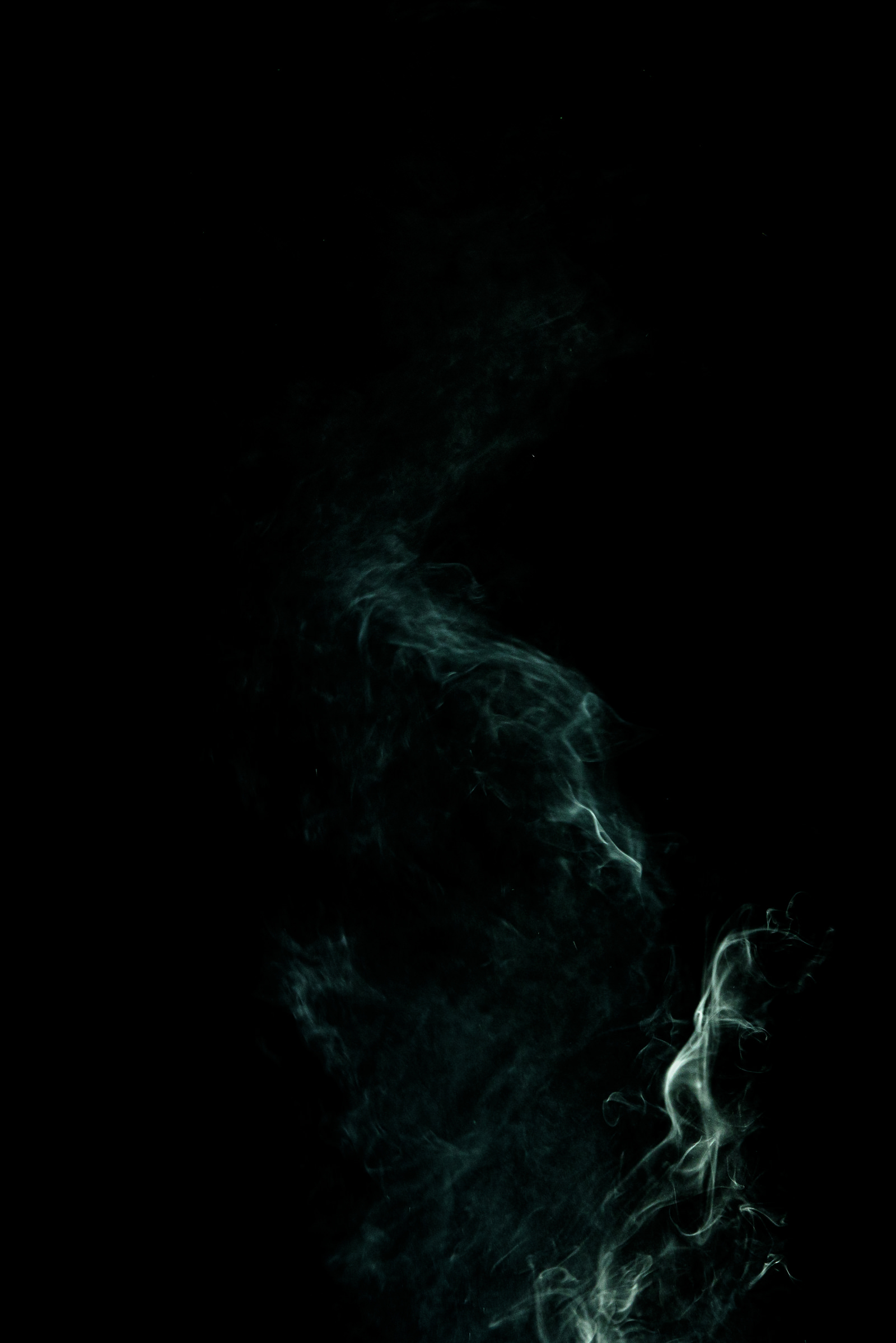 暗闇に立ち上る緑色の煙の写真素材です。黒い背景に緑色のスモークが縦に流れ、独特な形状を描きながら立ち昇っています。もくもくとした煙の動きが神秘的な雰囲気を演出し、デザインやアート作品、グラフィック素材の背景として活用できます。