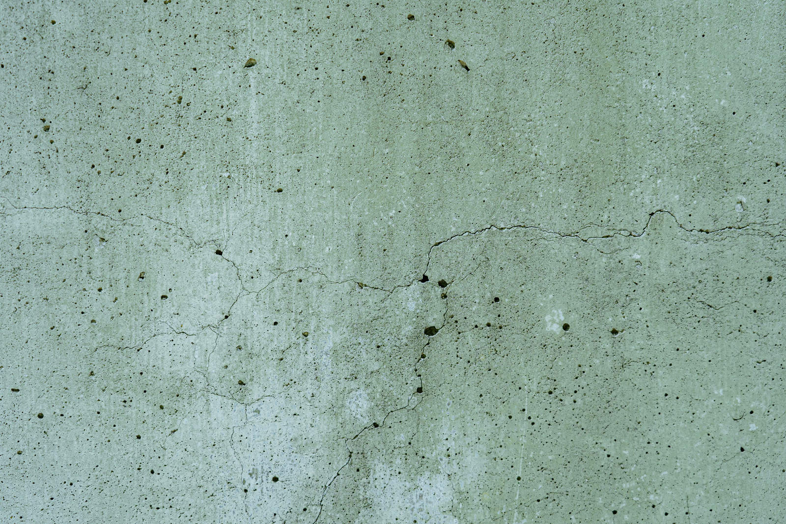 ひび割れが入ったコンクリート壁のテクスチャーの写真素材です。薄緑がかったグレーのコンクリート表面に、細かなひび割れや小さな穴が点在しており、古い建物の外壁や内壁の質感を表現しています。背景デザインやテクスチャー素材、建築関連のコンテンツなどにおすすめです。