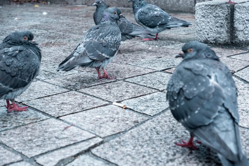 Feral Pigeons Gathered on Stone Pavement in Urban Plaza