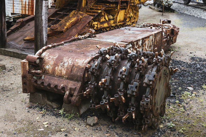 炭層を削る採炭機械ドラムカッターの写真素材です。直方市の石炭記念館に展示されている錆びた金属製の機械で、先端にはチェーンソーのような刃が付いており地面に設置されています。産業遺産の紹介や地域文化を伝えるWebサイト、歴史関連のブログ、採炭技術の説明資料などに最適です。