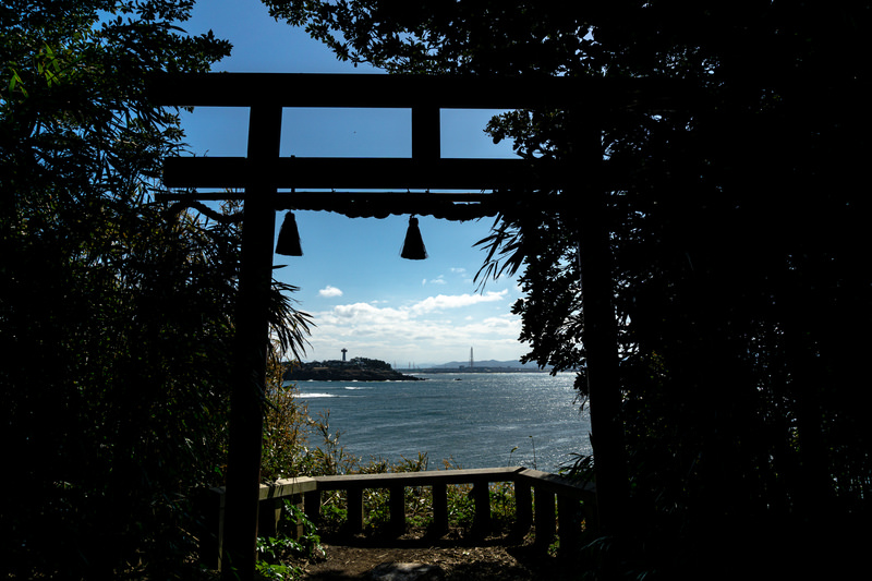 View of Tojinbo from within the torii gate of Ominato Shrine facing the sea