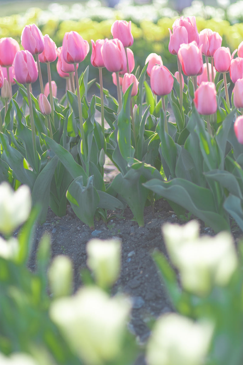 花壇に密植されたピンク色のチューリップの写真素材です。温かい光を受けた花びらが透け、手前には白いチューリップがぼけて写っている。春のイベント告知や観光案内におすすめです。
