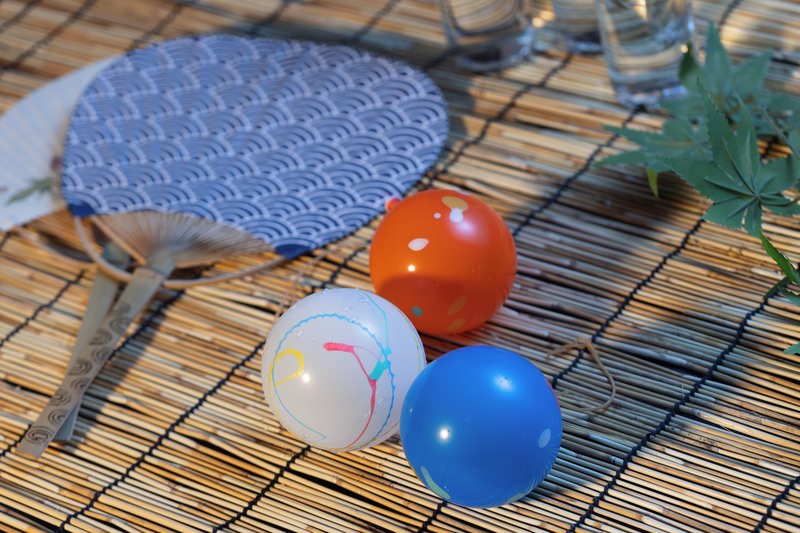 水風船と団扇を配置した夏祭りの写真素材です。竹製のすだれの上に青い柄の団扇と赤、白、青の水風船が置かれており、涼しい夏の雰囲気を演出しています。夏祭りや納涼イベント、ポスター制作、夏の販促物などに活用できます。