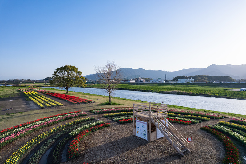 春のチューリップ畑を高い場所から見渡した写真素材です。赤・黄・ピンクなど多色の花が縞状に広がり、中央には木製の展望台が立っている。春のイベントや観光・地域PRの素材に使えます。