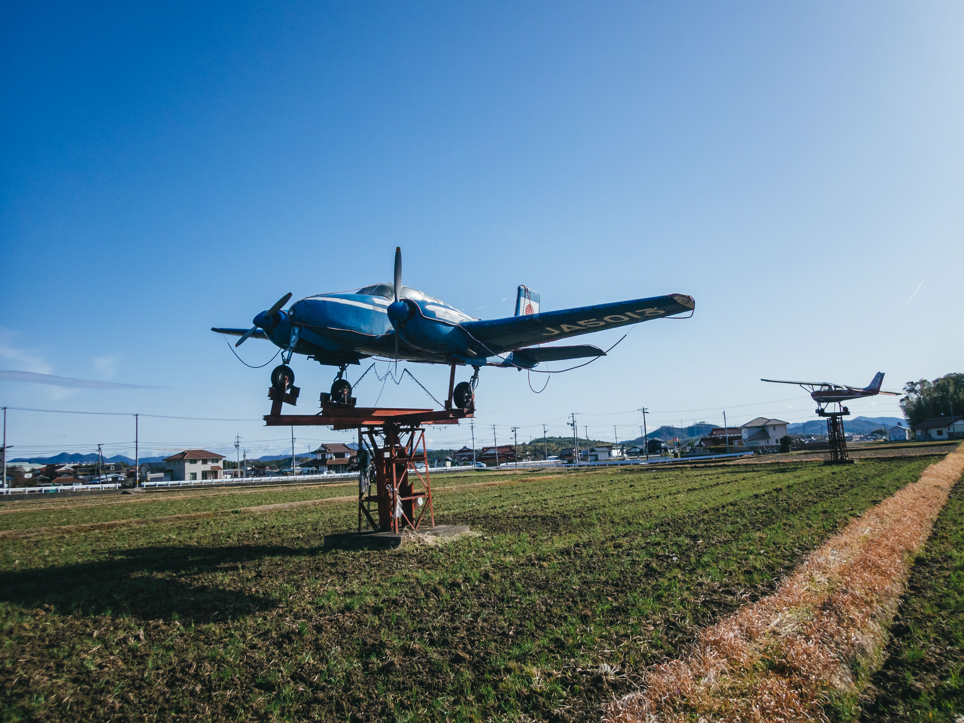 田んぼの中に展示された航空機の写真素材です。青空の下、緑色に生い茂る田んぼの中央に白い機体のプロペラ機JA5013が置かれており、ビーチクラフト社の小型機が地域の景観と調和しています。航空関連のコンテンツ制作や地域紹介、乗り物資料などに活用できます。