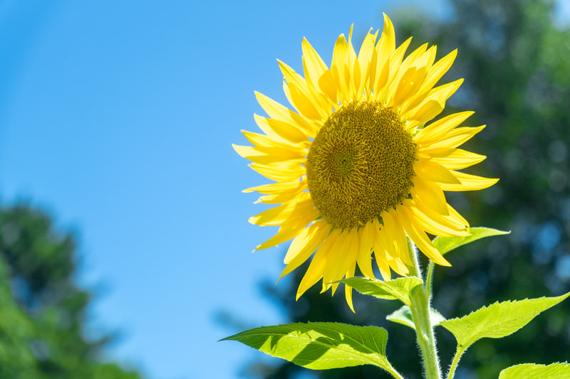 青空とひまわりの花の写真素材です。黄色い花びらと茶色い中心部を持つひまわりが緑の葉とともに満開で咲いており、向日葵が群生する壮観な光景が映っています。夏のイメージや自然をテーマとしたデザイン、季節素材などにおすすめです。