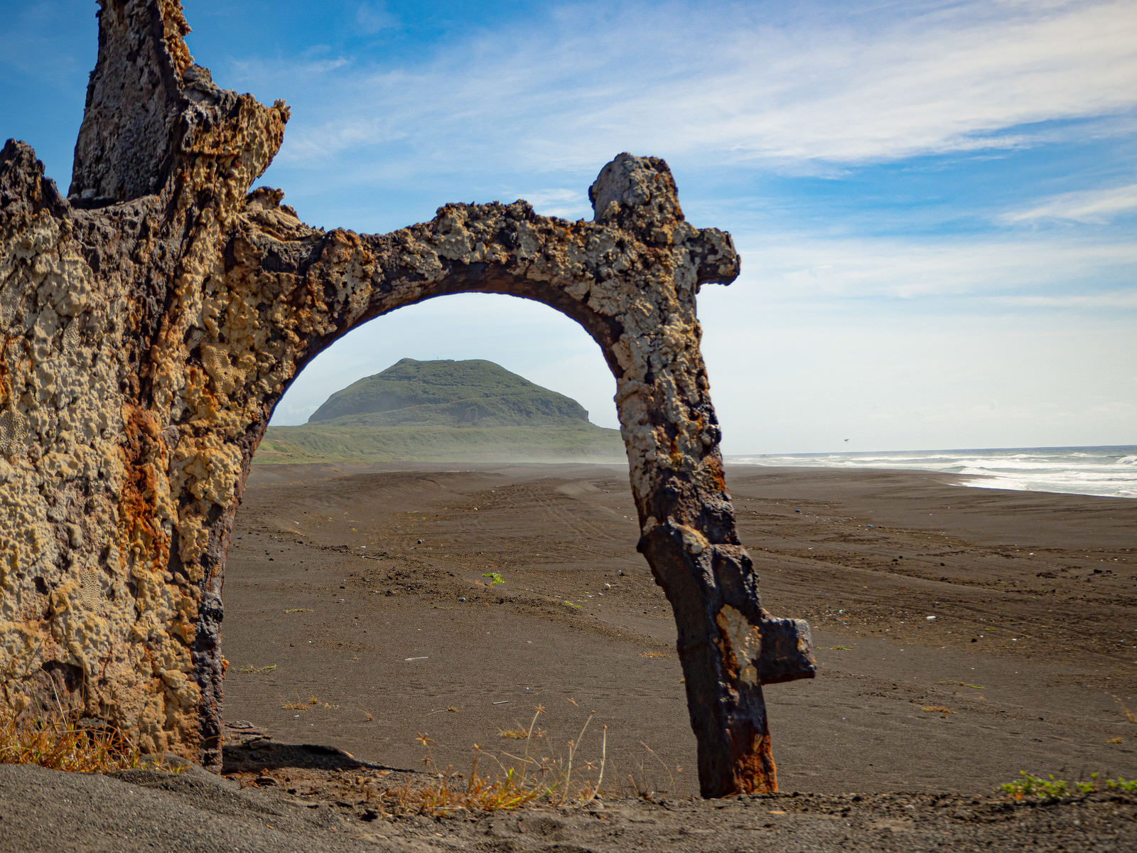 Mount Suribachi visible beyond coral-covered rubble, with expansive sandy beach and waves rolling onto shore