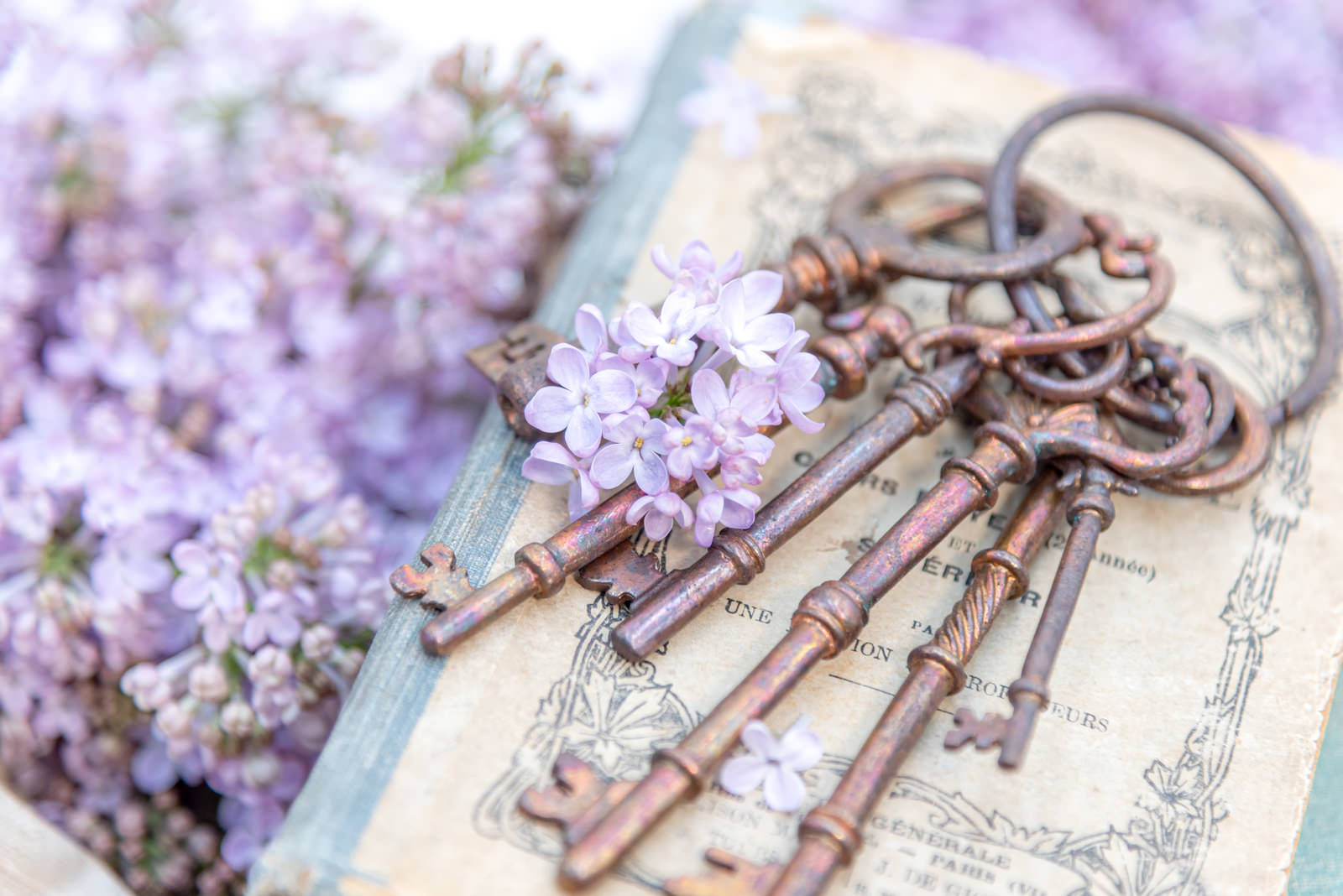 ライラックの花と古い鍵の写真素材です。開かれた洋書の上に淡い紫色のライラックの花束が置かれ、アンティーク調の古い鍵が添えられています。春の季節感とロマンチックな雰囲気を表現しており、Webサイトのヘッダー画像やブログのアイキャッチ画像、季節素材として活用できます。