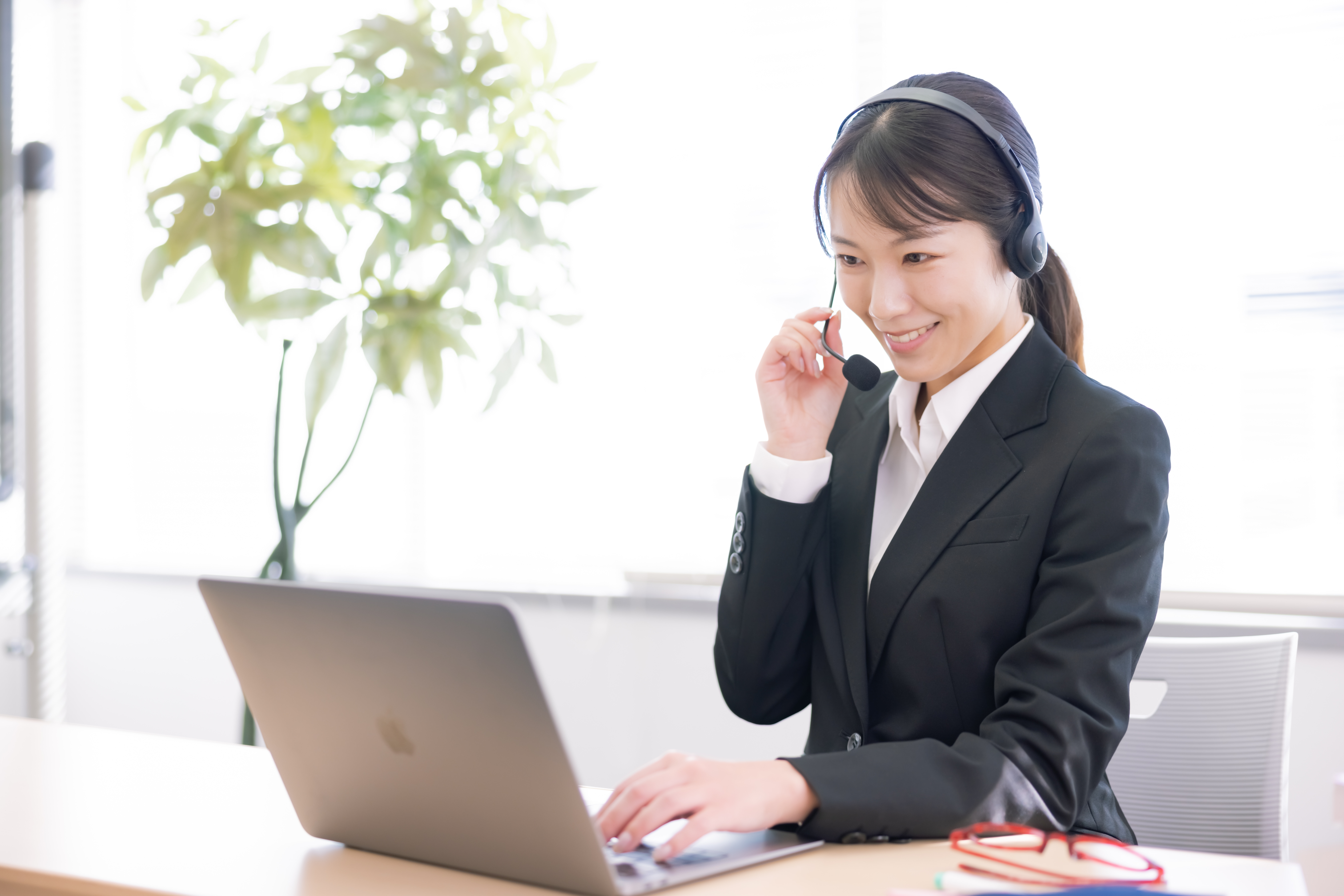 ヘッドセットを着用してクレーム対応をする女性オペレーターの写真素材です。パソコンの前で笑顔で電話対応し、テレアポやカスタマーサポート業務を丁寧に進めている様子が映っています。コールセンター業務紹介やカスタマーサポート関連のウェブサイト制作、企業研修資料などにおすすめです。