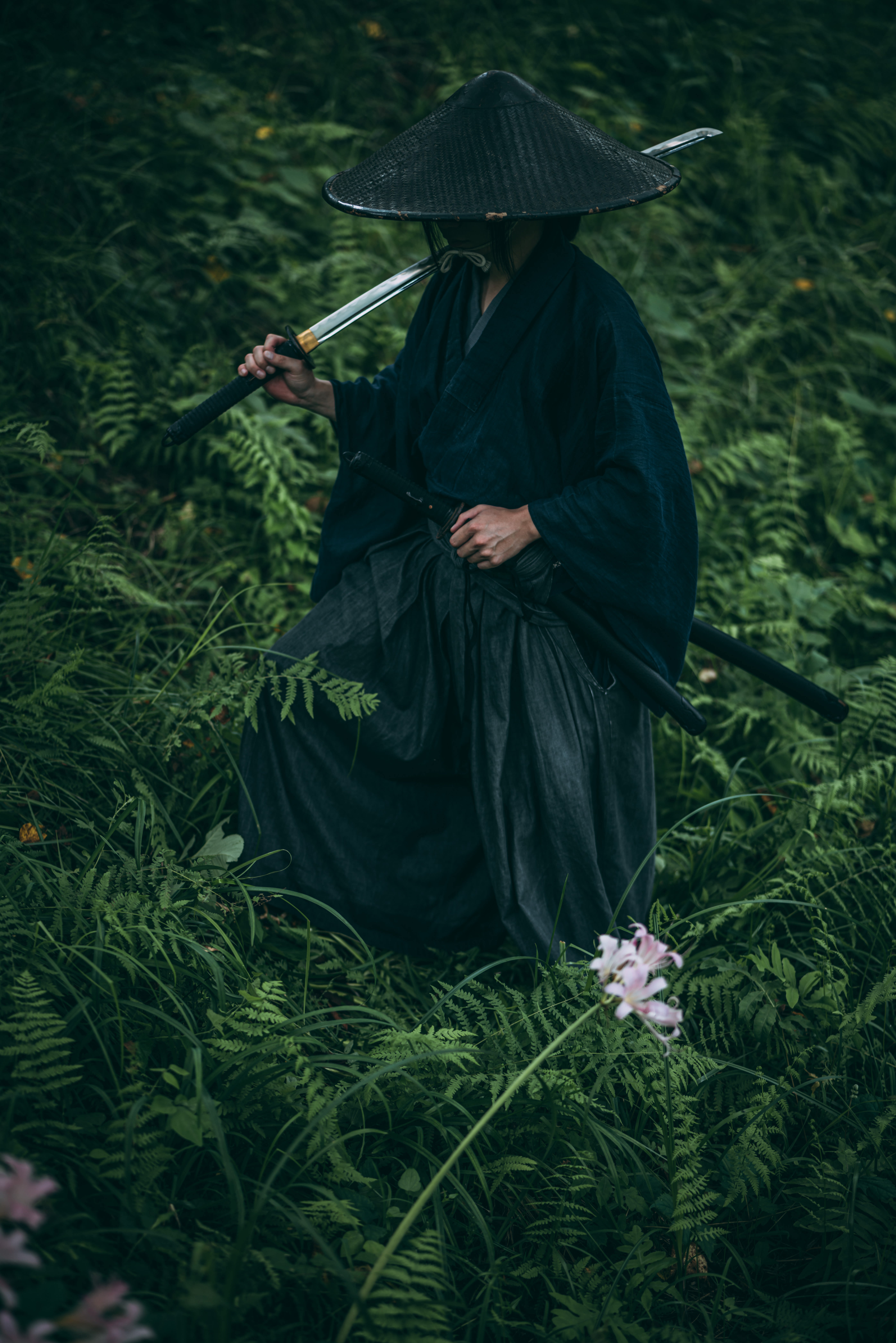 草原で日本刀を構える侍の写真素材です。網代笠を被った男性が緑の草むらの中に身を潜め、日本刀を持って警戒する追手の姿勢を取っています。袴姿で刀を構える用心棒のような立ち振る舞いが、時代劇や歴史コンテンツ、和風デザインなどにおすすめです。