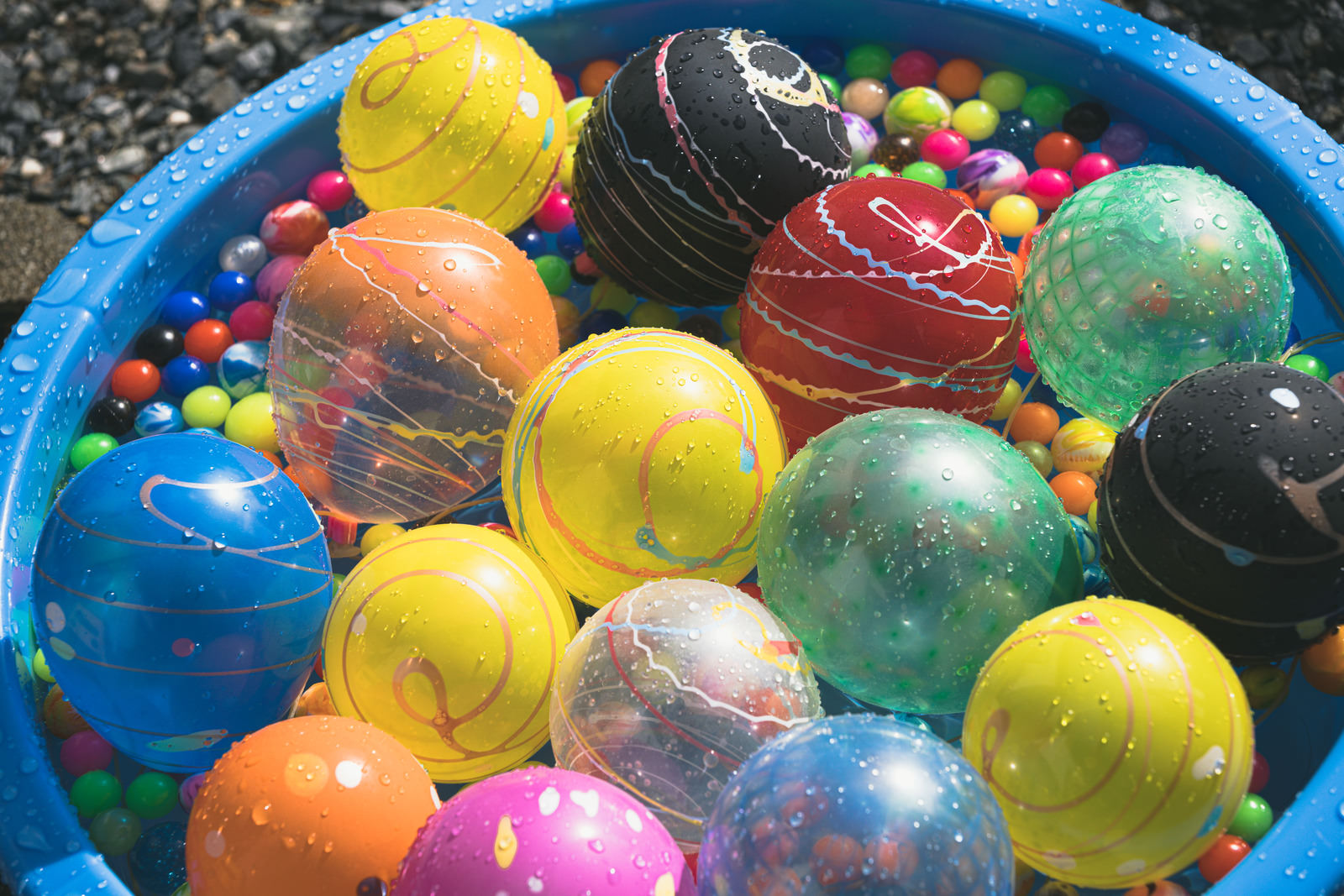 カラフルなヨーヨーとスーパーボールが水に浮かんでいる写真素材です。青い容器の中に青、赤、黄、緑などの色とりどりのおもちゃが水面に浮かび、水風船と共に水滴がついています。夏祭りやお祭りのイベント関連、水遊びテーマのデザイン制作などにおすすめです。