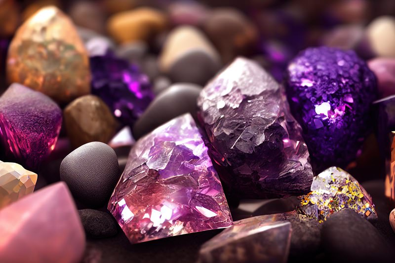紫のクリスタルと小石が並ぶ画像