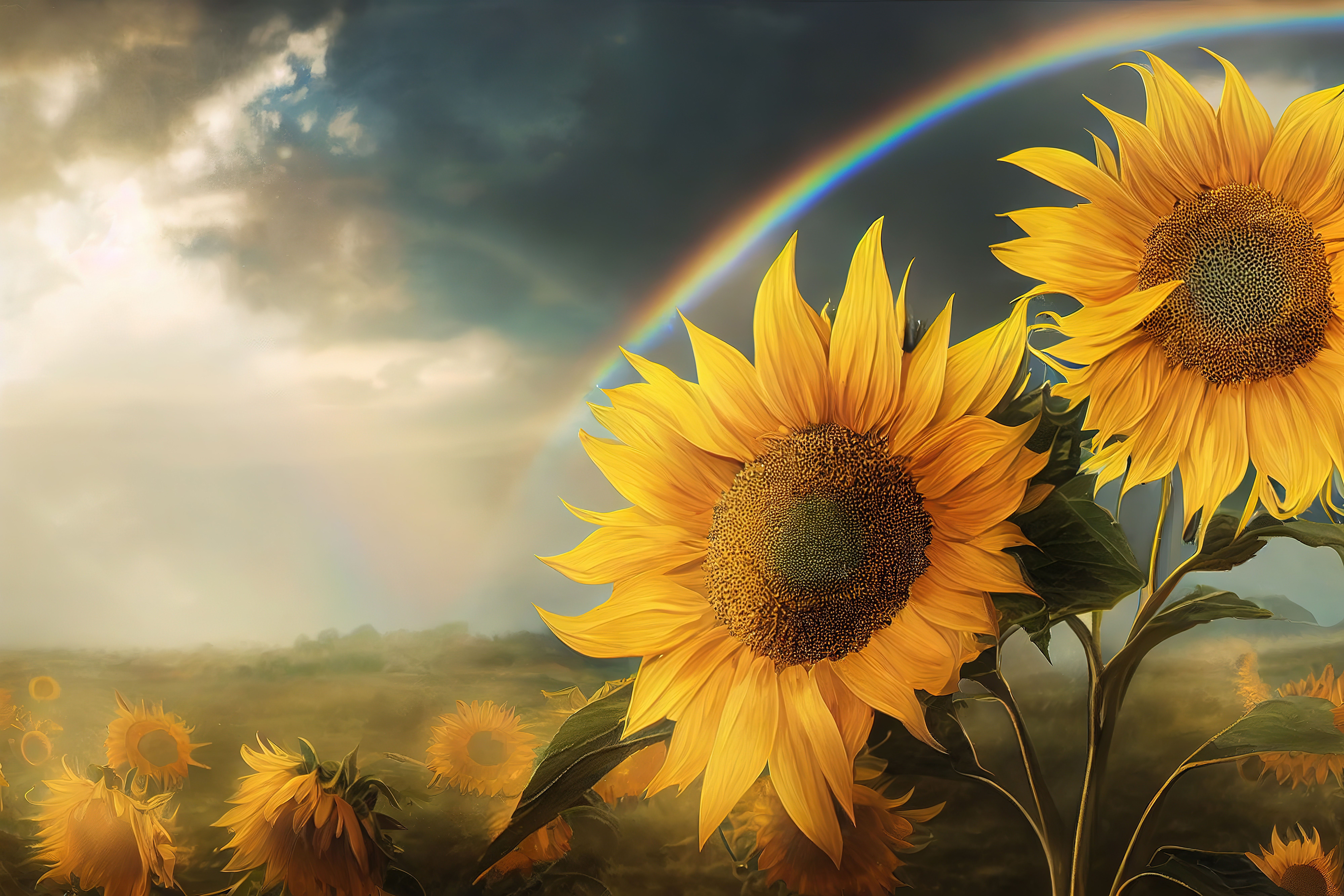 AIで生成したひまわり畑と虹の画像素材です。広大な畑に咲くひまわりの上空に虹が弧を描き、暗い雲の合間から光が差し込んでいる。Webサイトのヘッダーやポスター、壁紙素材としておすすめです。