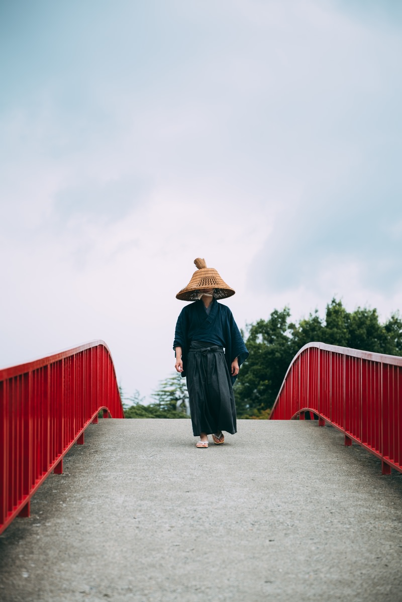 笠を被り橋を歩く侍の写真素材です。網代笠を深く被った男性が、雪駄を履いて袴姿で赤い手すりの橋を渡っており、時代劇やゲーム、和風デザイン、侍コンテンツなどにおすすめです。