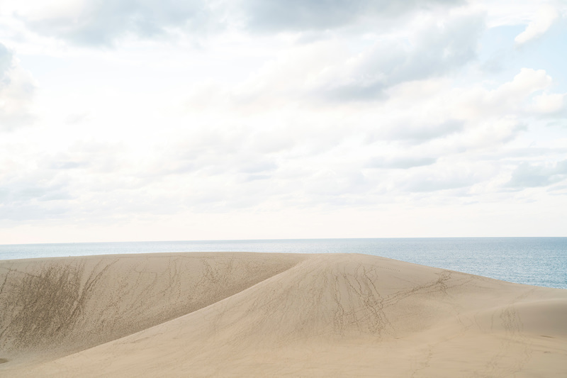雲間から差す光と鳥取砂丘の写真素材です。広大な砂地に海の水平線が見え、曇り空の雲間から柔らかな光が砂丘全体に降り注ぎ、自然景観の美しさを表現しています。観光地の風景撮影や旅行関連のコンテンツ制作におすすめです。