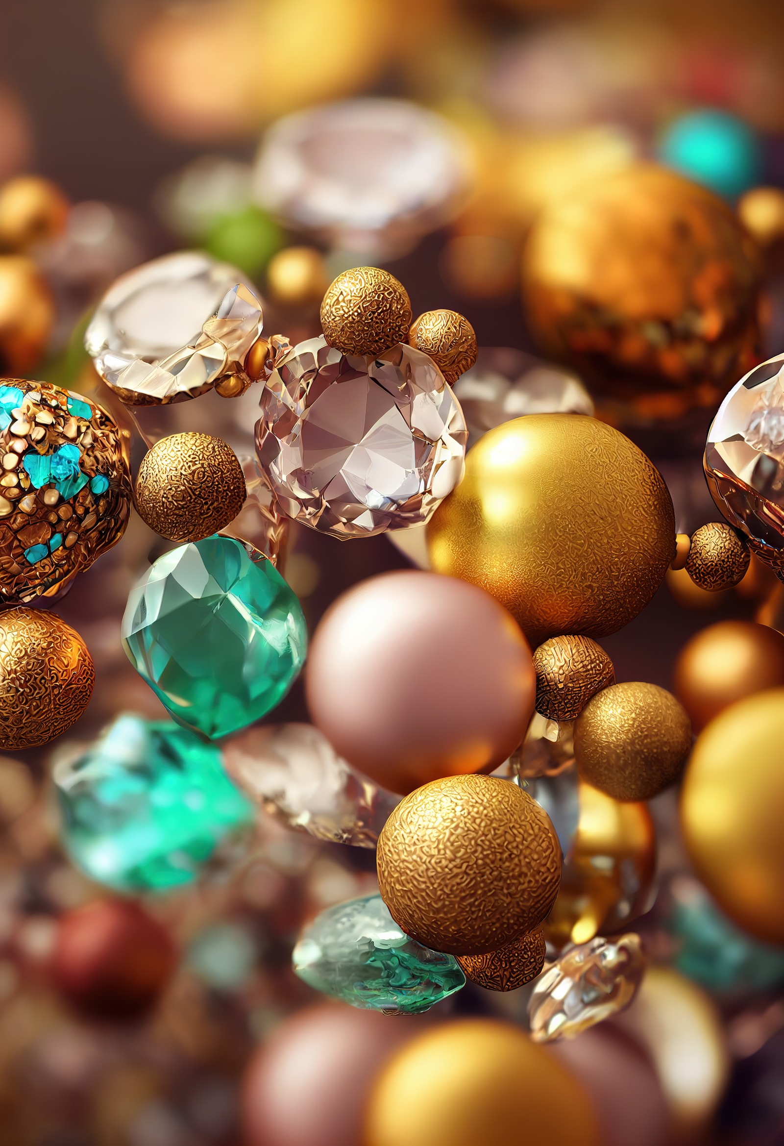 AIで生成した宝石とダイヤモンドの画像素材です。ゴールド、シルバー、グリーン、パープルなど多彩な色合いの宝石やお宝、財宝をモチーフとした豪華なオブジェクトが無造作に配置されています。アクセサリーやジュエリーデザイン、装飾背景として活用できます。