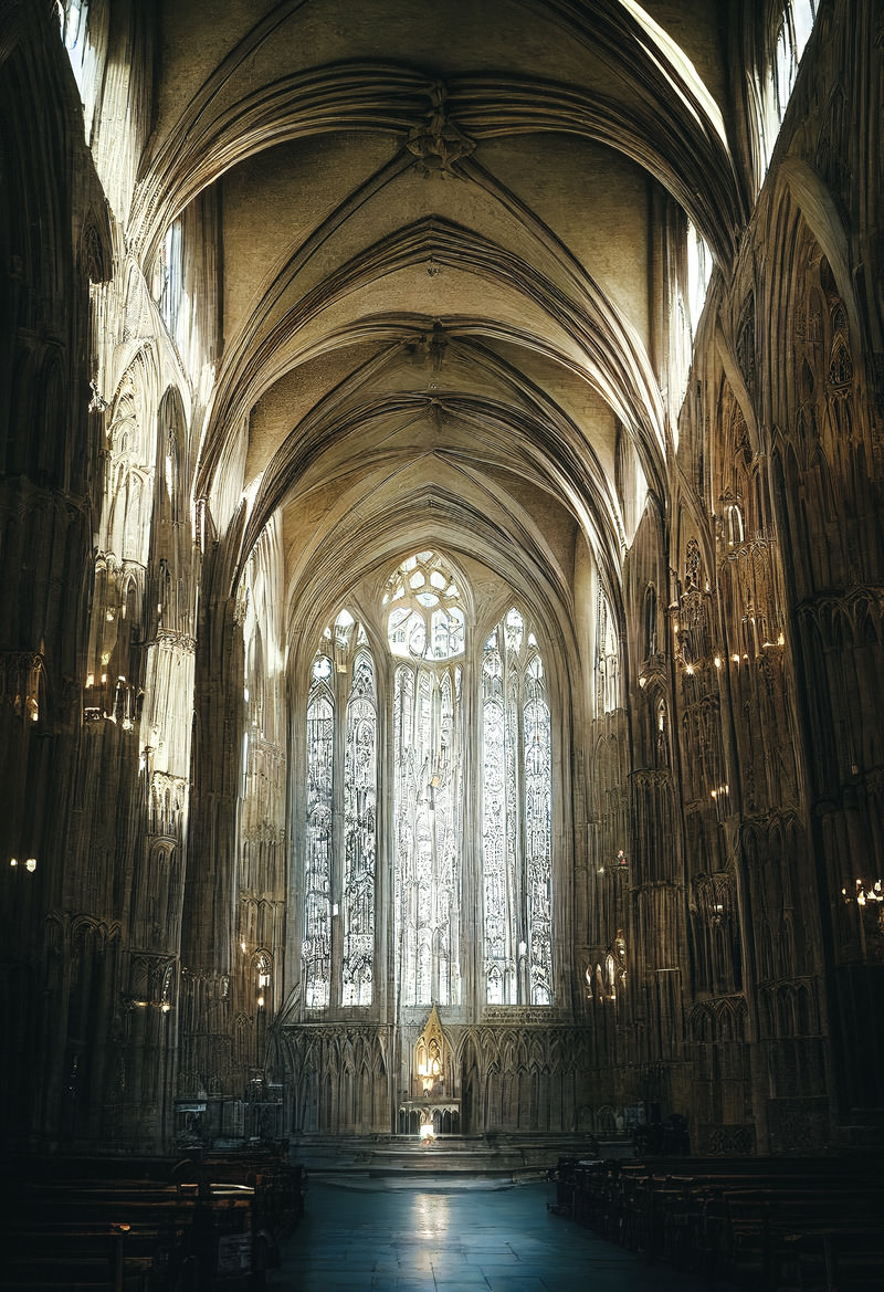 AIで生成した大聖堂風の礼拝堂の画像素材です。高い天井とゴシック調のアーチが立ち並び、ステンドグラスが光を通して神聖な空間を形成します。奥の祭壇周辺は荘厳な宗教的雰囲気に満ちており、教会のビジュアル表現やゲーム背景、建築資料として活用できます。