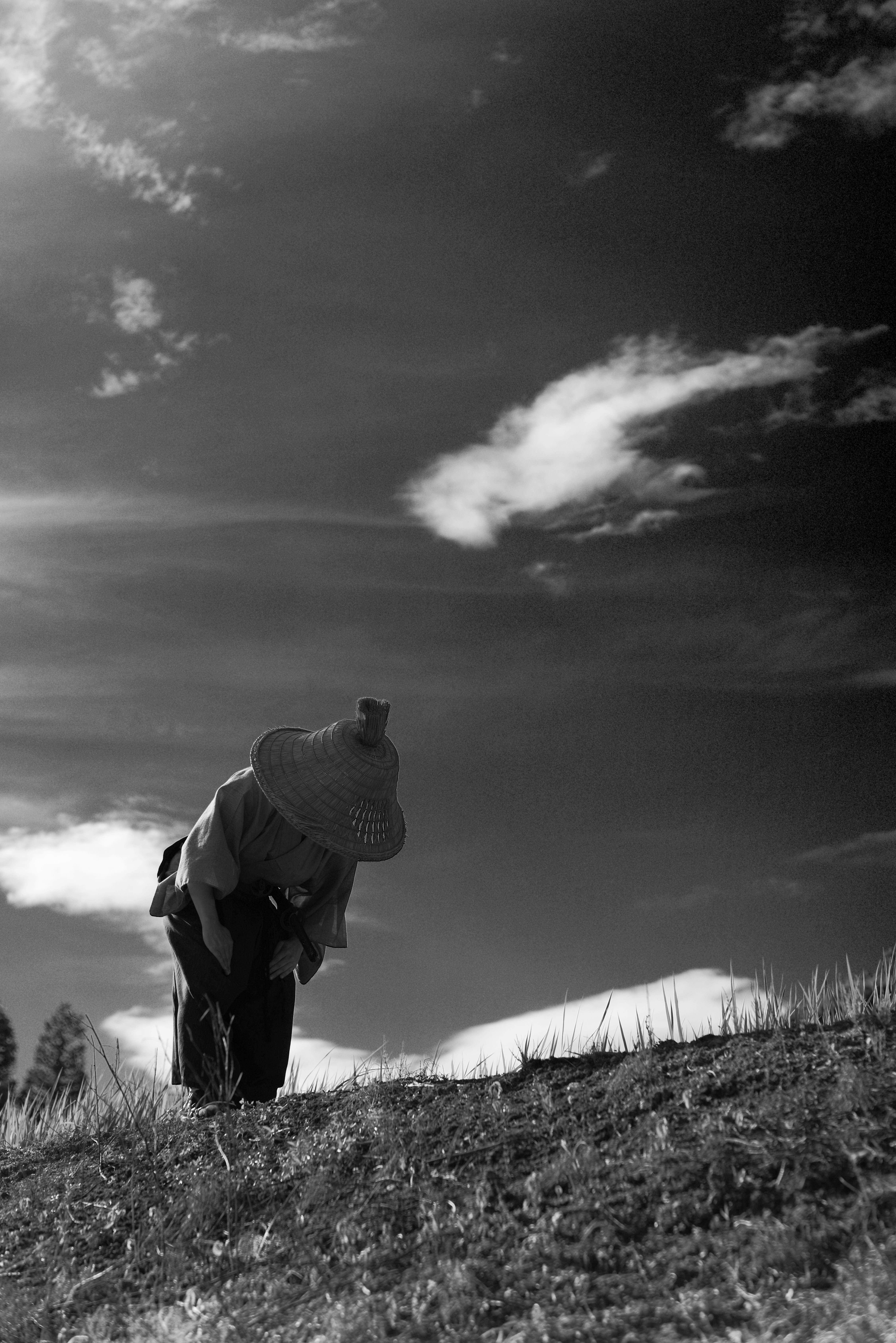 笠をかぶった袴姿で深々と頭を下げる侍の写真素材です。用心棒や武士として働く男性が、頭を大きく前に傾けて丁寧にお辞儀をしており、白黒で撮影された厳粛な表現が時代物の雰囲気を演出しています。時代劇コンテンツや和風デザイン、武士や礼儀を題材にした表現におすすめです。