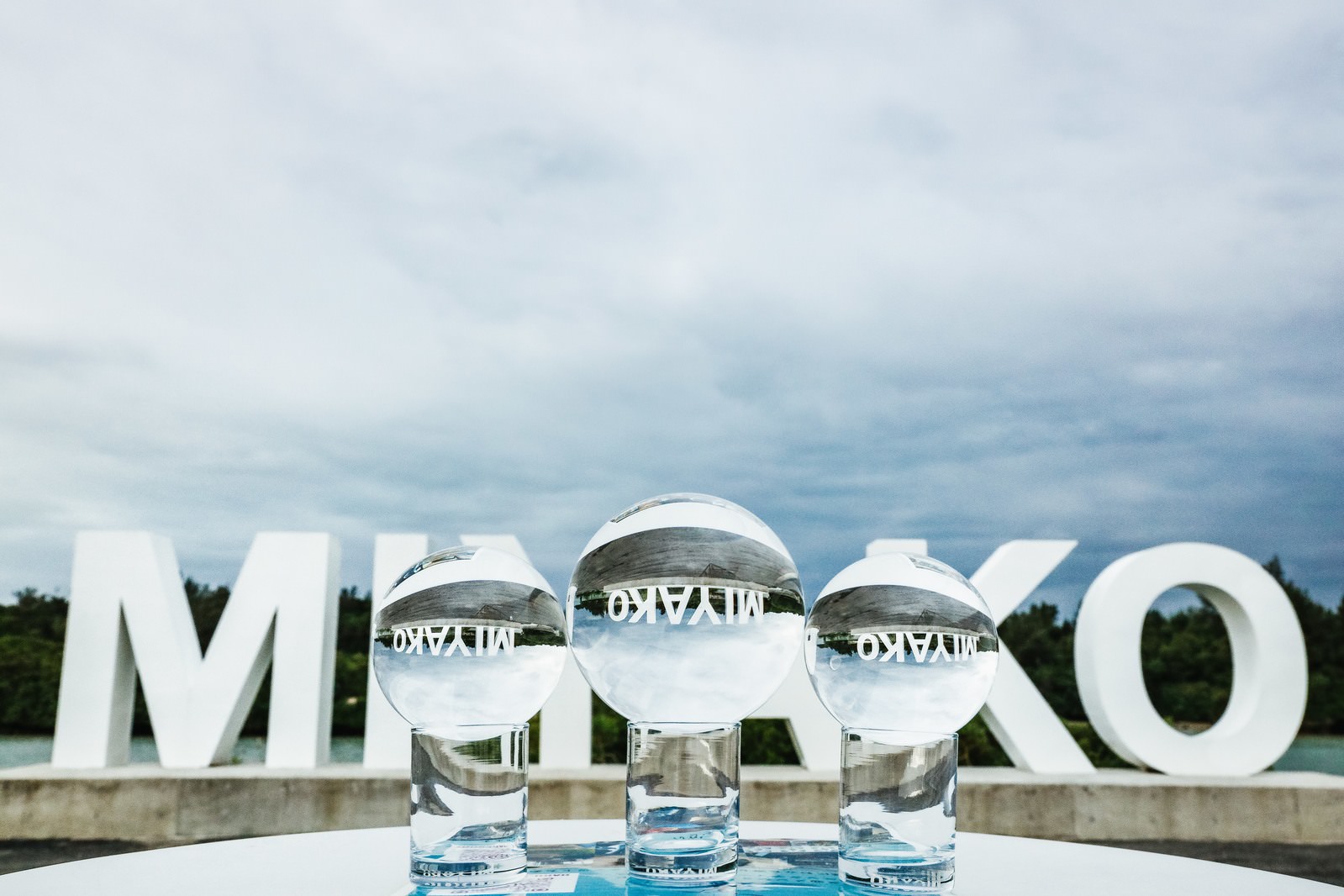 宮古島の記念碑前に並ぶ水晶玉の写真素材です。白いタイル張りのテーブルの上に置かれた3つの透明な球体が、曇り空と記念碑のテキストを映し込み、独特の光学効果を生み出しています。リゾート地の観光素材やトラベル関連、夏の旅行コンテンツなどにおすすめです。