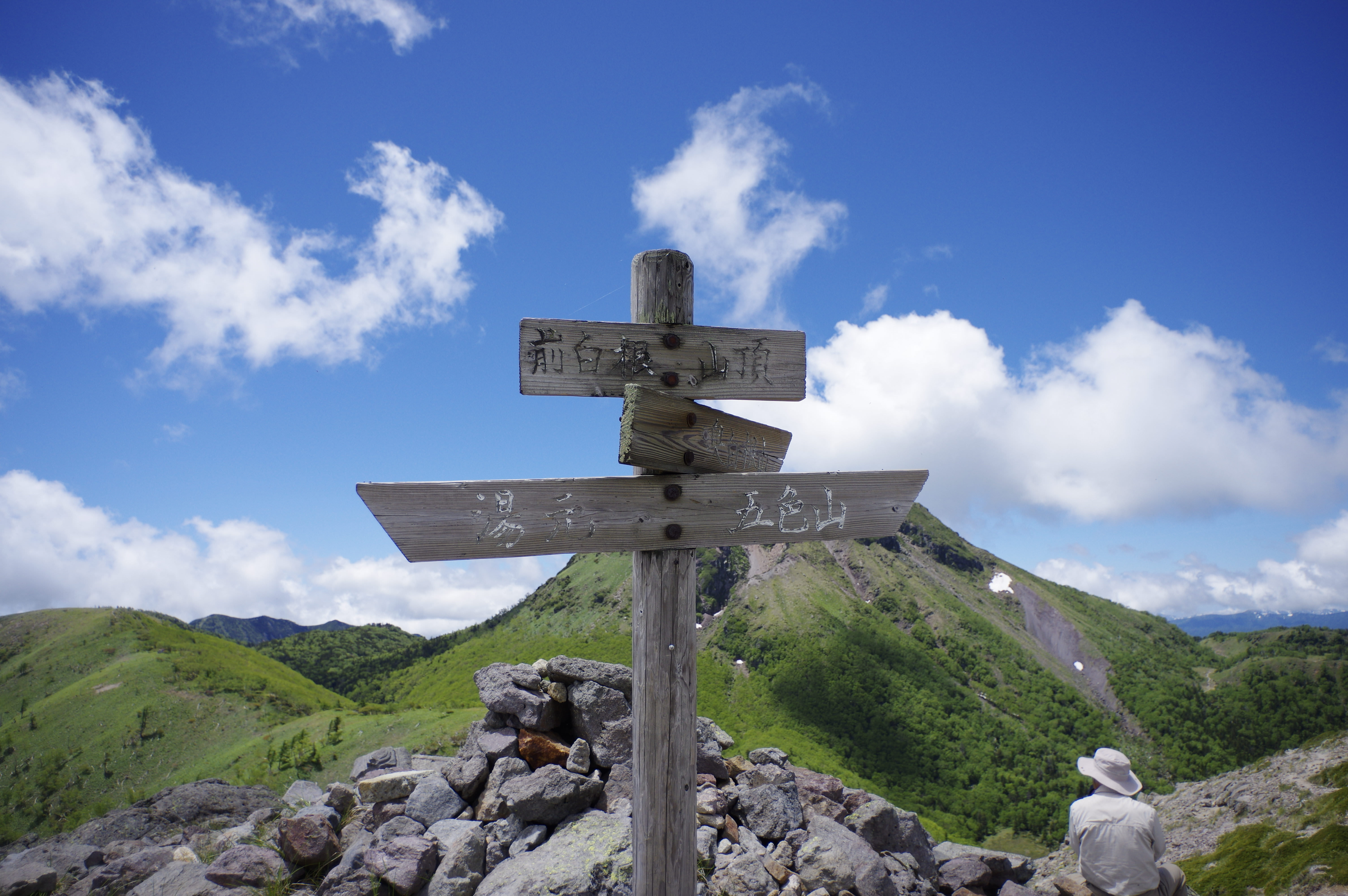 日光白根山の山頂標の写真素材です。日本百名山の一つである日光白根山の山頂に立つ木製の指導標が、青空と白い雲を背景に映えており、登山ブログや山岳関連のWebサイト、アウトドア系のデザイン素材におすすめです。