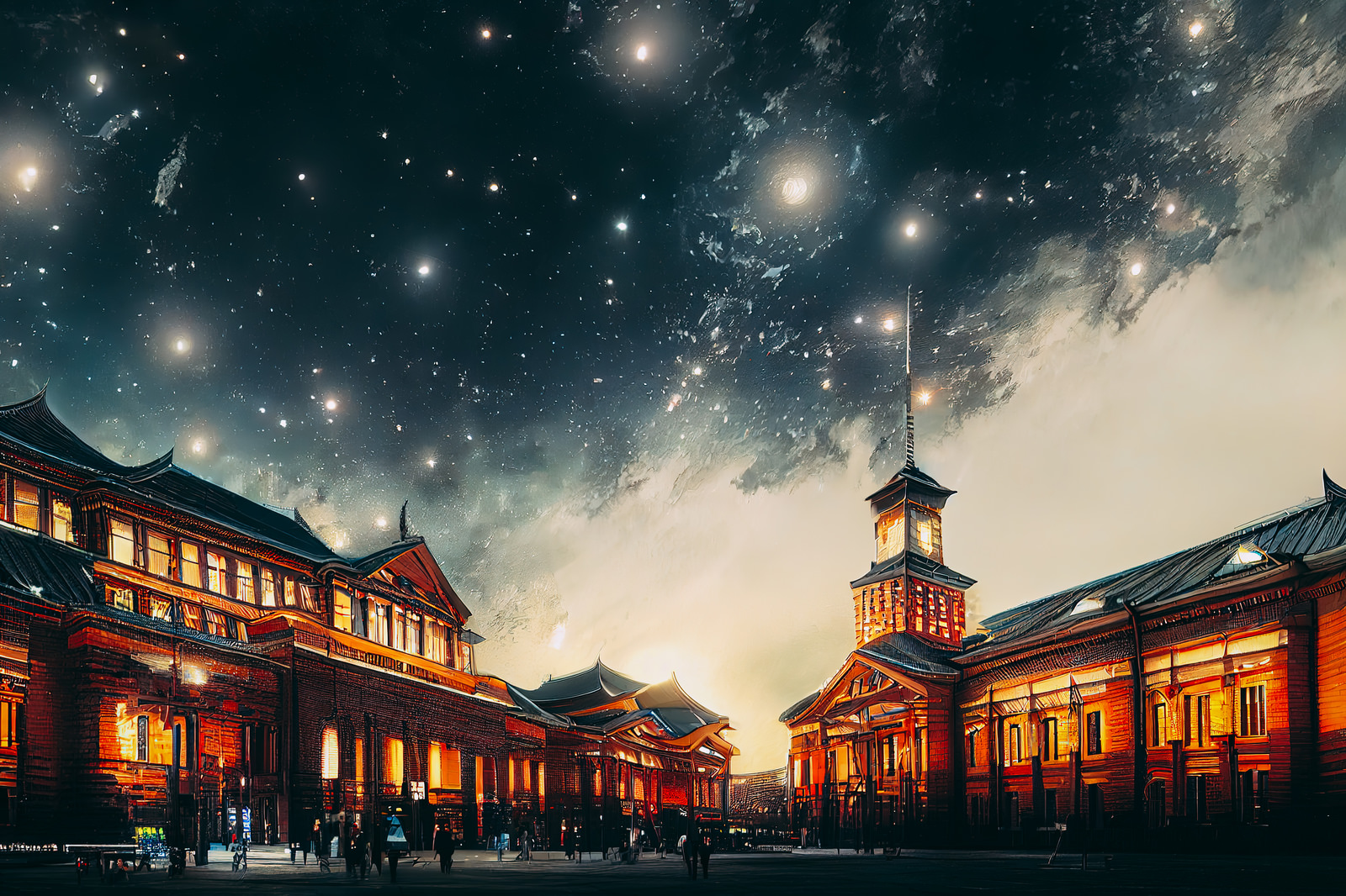 煌めく星とハイカラな赤煉瓦建物の夜景、星空に浮かぶ駅舎のAI画像素材(フリー)