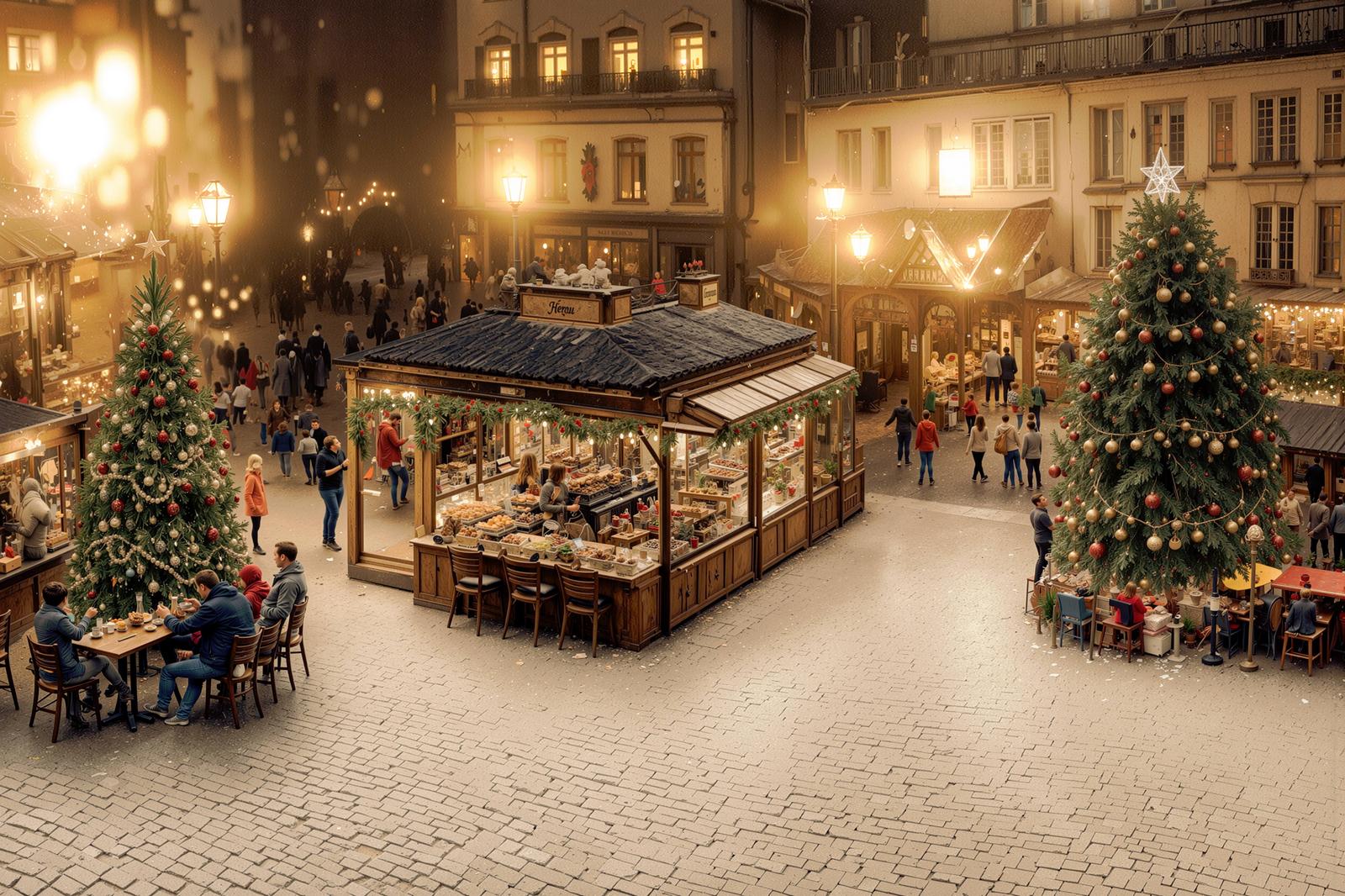 AIで生成したクリスマスマーケット風の画像素材です。石畳の広場に木製の屋台が並び、大きなクリスマスツリーが立ち、温かいライトアップで冬の夜を照らす、ヨーロッパの伝統的な雰囲気を演出しています。クリスマスイベントの広告やブログ、季節装飾の参考資料におすすめです。