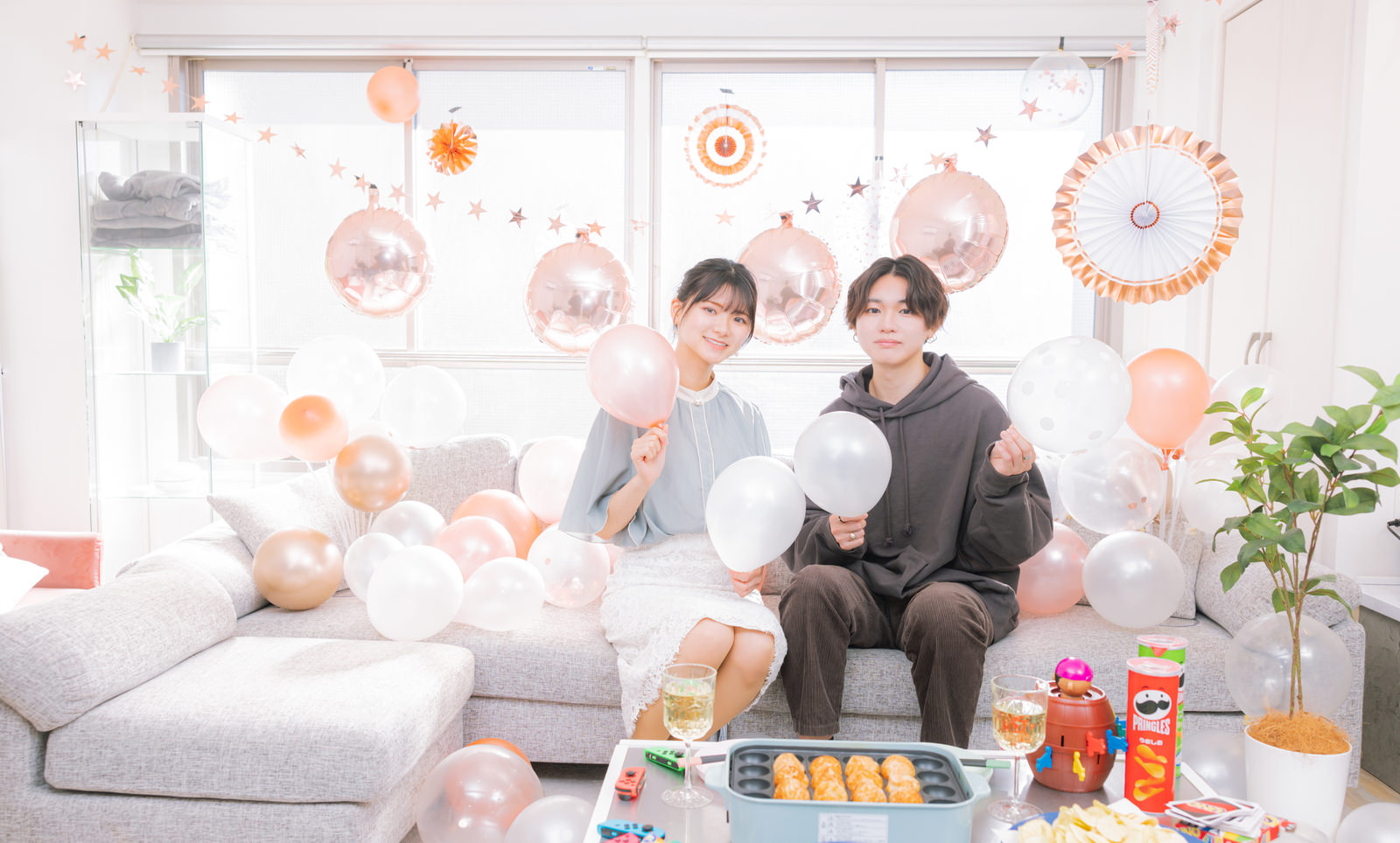 記念日にホームパーティーでお祝いする恋人の写真素材です。ソファーに座った男女がシャンパンを手に乾杯している場面で、背景には風船やお祝い装飾が華やかに飾られています。誕生日や記念日のお祝いシーン、カップルのパーティー素材としておすすめです。