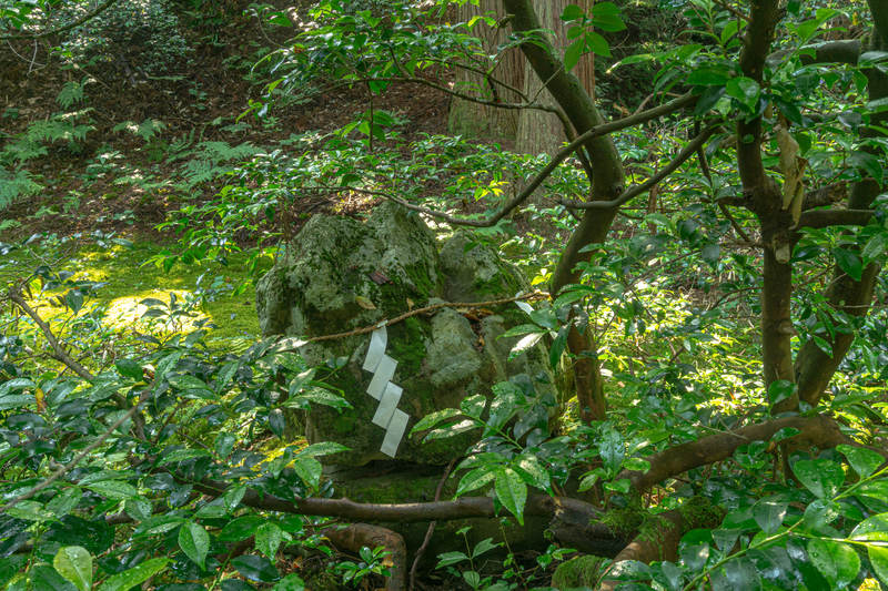 平泉寺白山神社の本社横にある注連縄を張られた岩の写真素材です。深い緑の苔に覆われた岩が注連縄で囲まれ、古い歴史を持つ神社の境内に静寂の中で佇んでいます。神社の歴史や参拝記事、神聖な空間を表現するコンテンツに最適です。