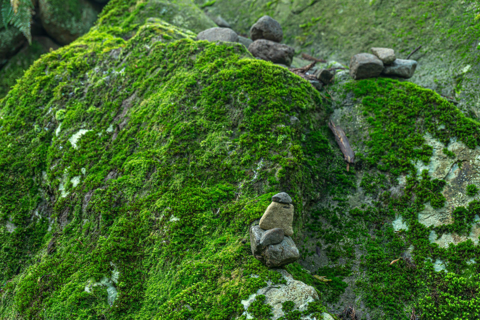 Stones skillfully stacked on moss-covered rocks