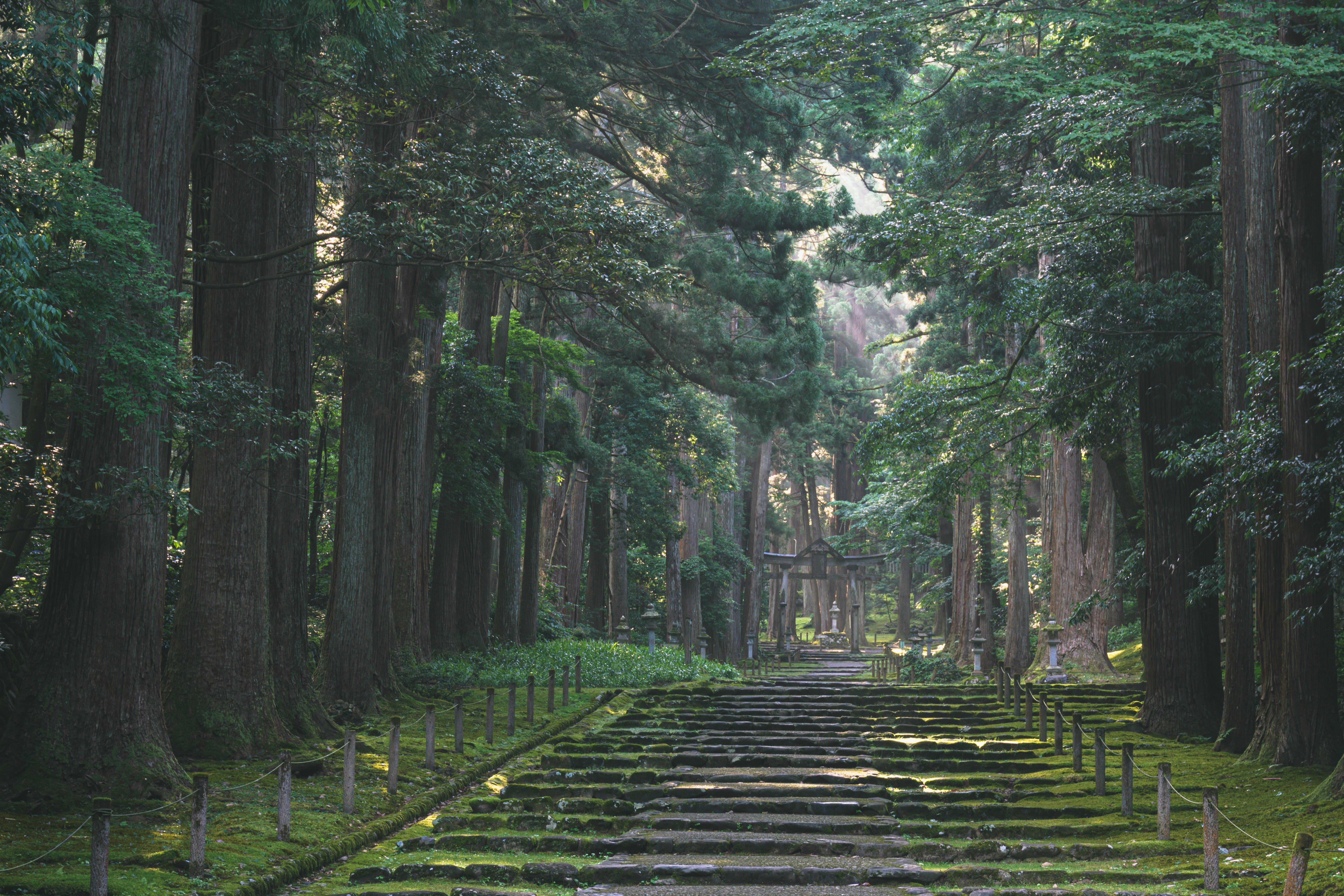 木漏れ日が光の帯を描く二の鳥居へと続く参道の写真素材です。石段の両脇に立つ苔むした杉の巨木から差し込む木漏れ日が、石畳に光の縞模様を作り出し、参道の奥には二の鳥居が静かに佇んでいます。神社参拝や季節の風情、神聖な場所の表現などにおすすめです。