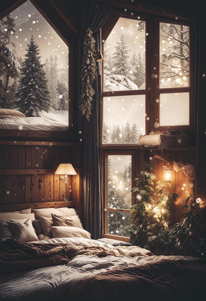AIで生成した寝室風のクリスマスシーン画像素材です。室内の暖炉の傍にはクリスマスツリーとイルミネーションが飾られ、窓の外には雪が積もった屋外の冬景色が広がっています。クリスマスシーズンのSNS投稿やブログ、冬のインテリアデザイン制作に活用できます。