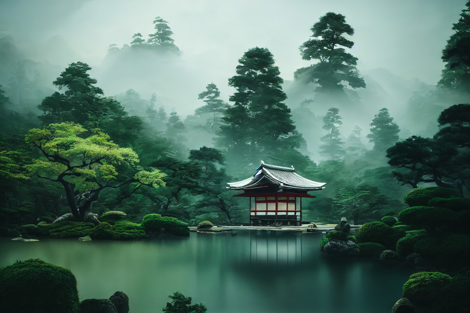 深緑と霧の池泉庭園に建つ東屋のAI画像素材(フリー)