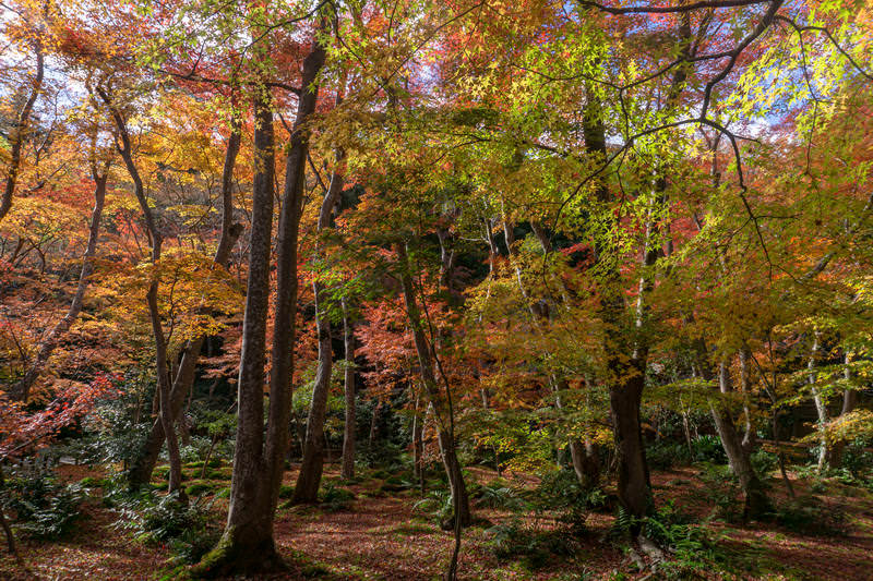 祇王寺の庭園で撮影した紅葉の写真素材です。日の光を浴びて赤く色づいたモミジの葉が光に映え、京都の寺院を代表する秋の景勝地として知られています。観光案内やブログ、秋の季節素材として活用できます。