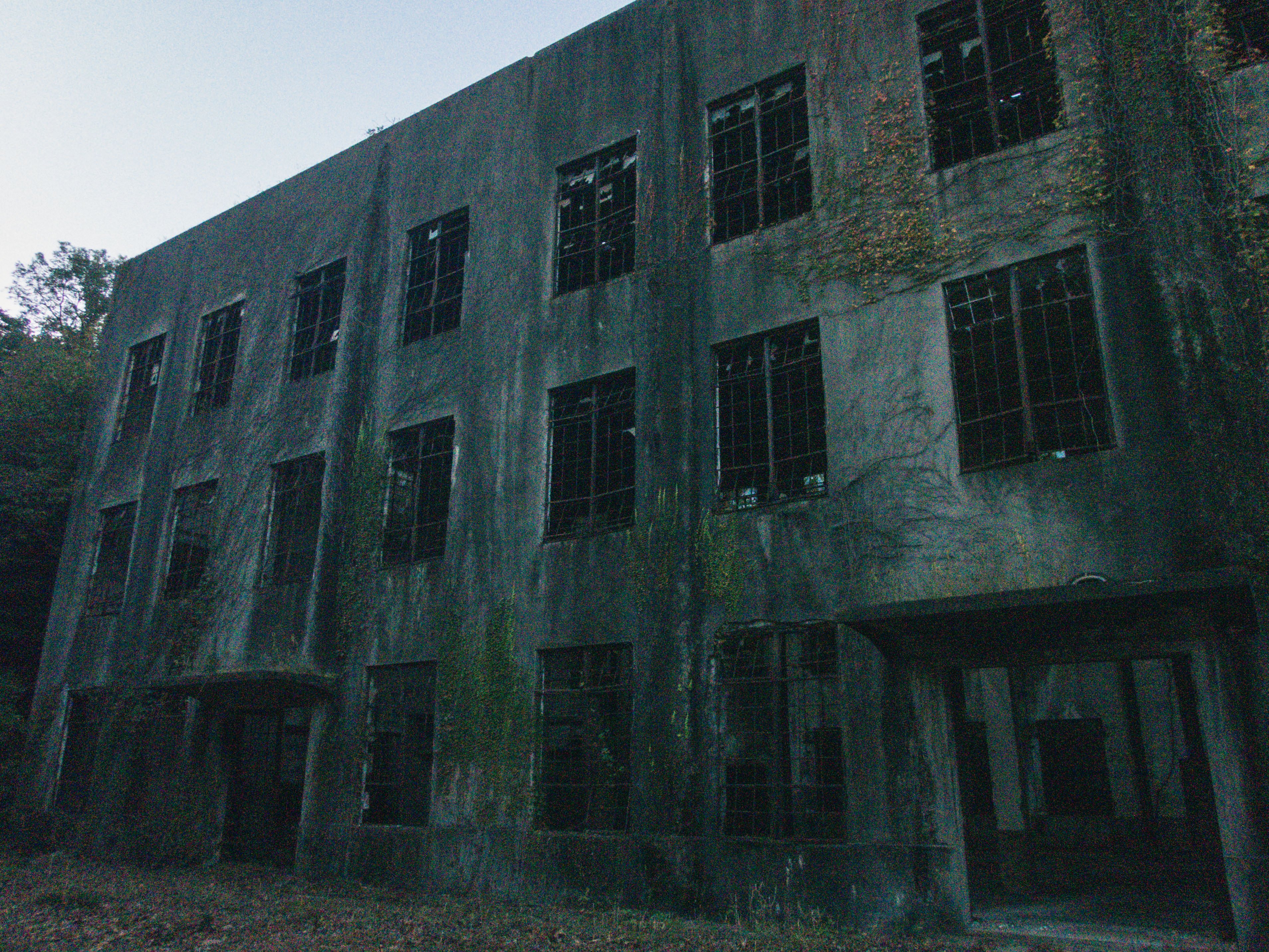 窓ガラスも扉もない廃墟の写真素材です。コンクリート造りの建物で窓枠だけが残り、ガラスや扉が失われ内部が露出した不気味な状態となっており、経年劣化で壁面が損傷しています。ホラー系コンテンツやゲーム背景、廃墟表現などにおすすめです。