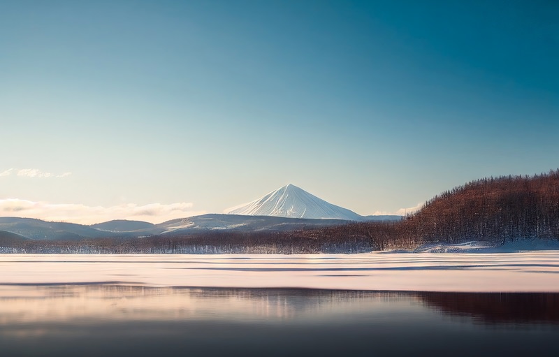 AIで生成した冬の湖畔風景の画像素材です。雪を被った山々が湖面に鏡のように映り込み、澄み渡った青空と穏やかな水面が調和する静寂な冬の自然風景で、山々の壮大さと湖面の透明感が特徴的です。冬の風景やリフレクション表現が必要な広告やwebサイト、印刷物におすすめです。