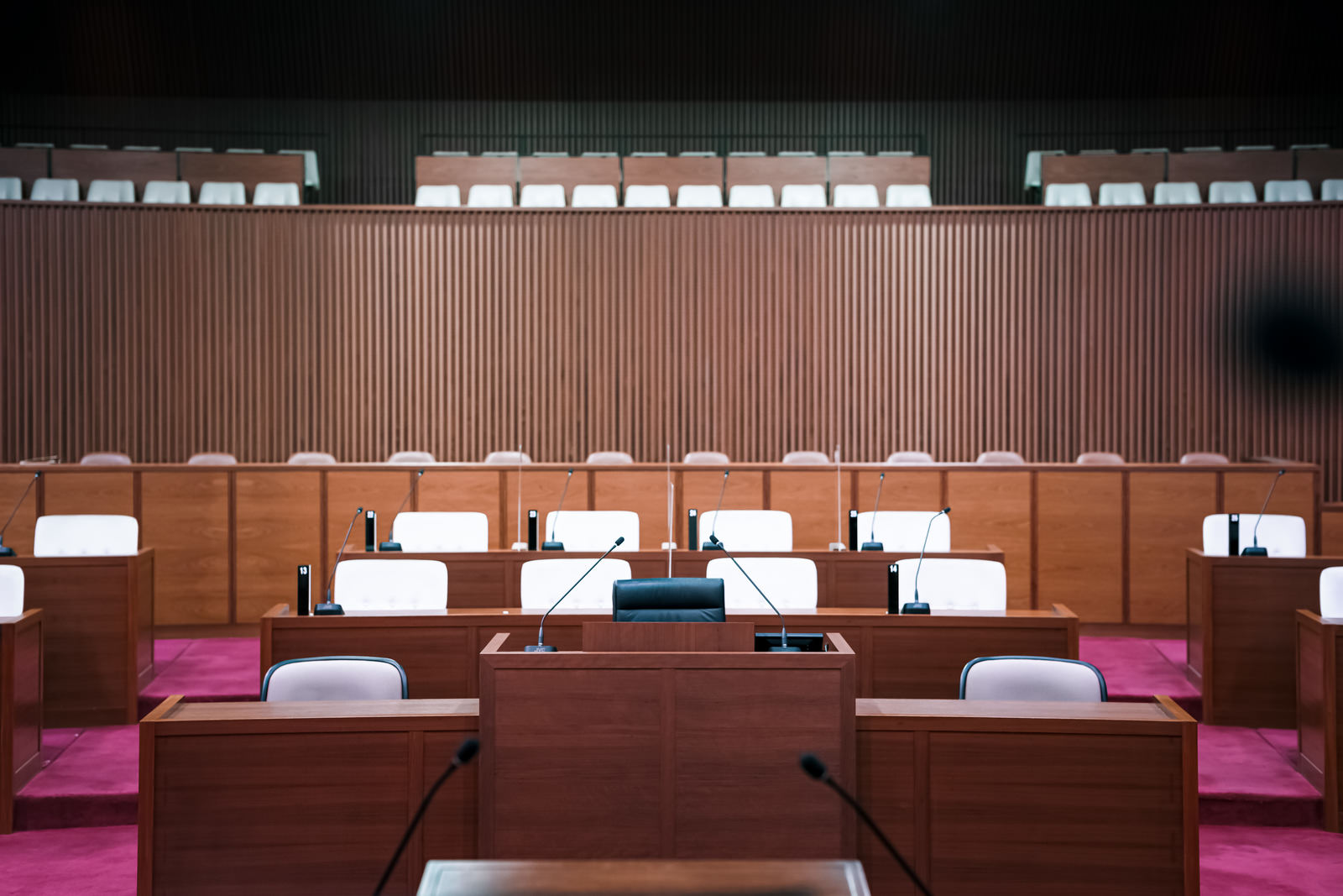津山市議会の傍聴席の写真素材です。赤紫色の絨毯が敷かれた傍聴スペースに白いクッション付きのベンチが複数列設置され、奥には議員が座る木製の議席が整然と並んでいます。市民向け施設紹介、自治体サイトの更新素材、公民教育のコンテンツなどにおすすめです。