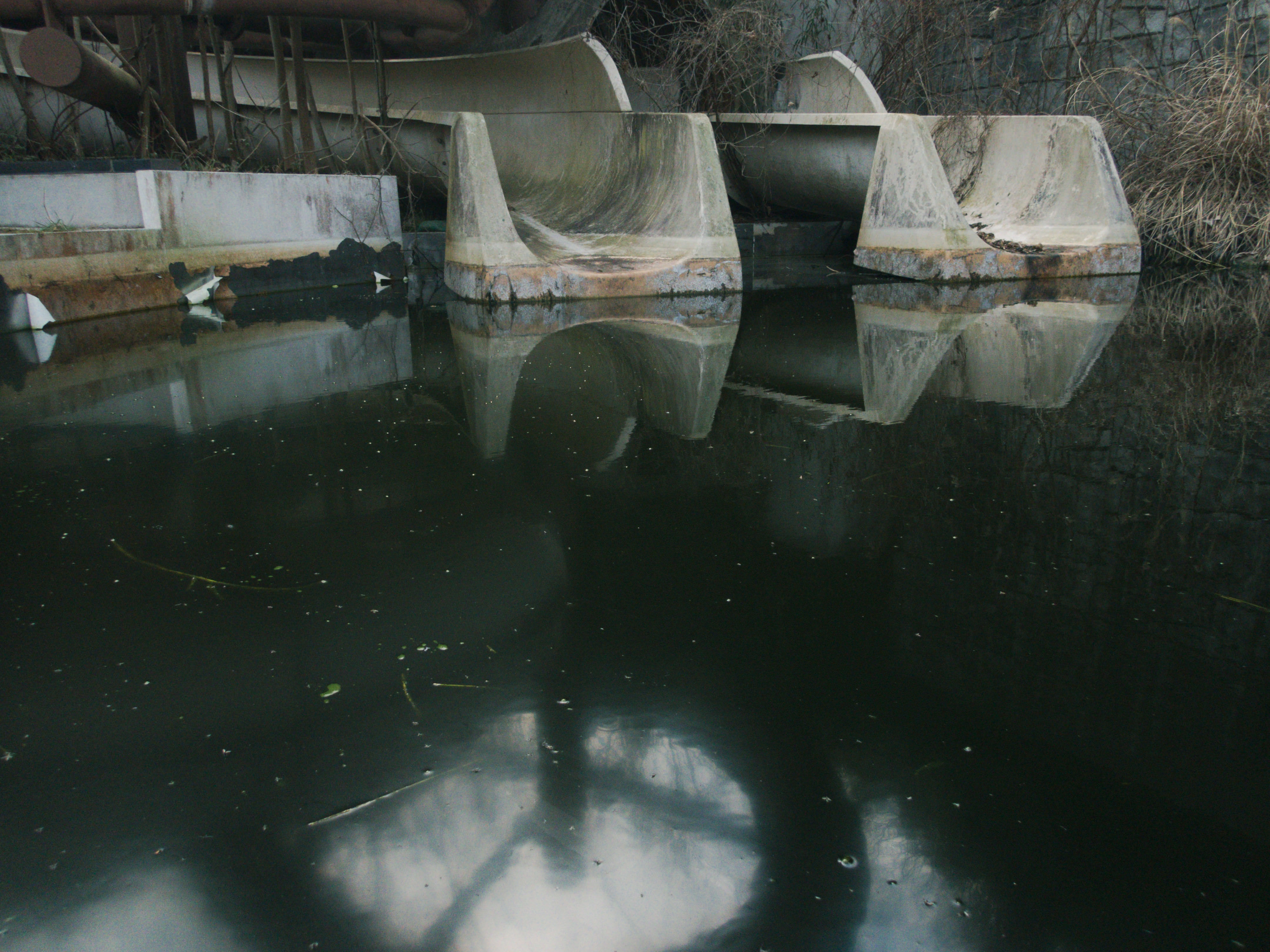 水が溜まった廃プールと滑り台の写真素材です。コンクリート造りのプール内に溜まった水面に周囲の景色が映り込み、その奥にはコンクリート製の滑り台が設置されています。放置された建築物の経年変化や廃墟撮影の素材として活用できます。