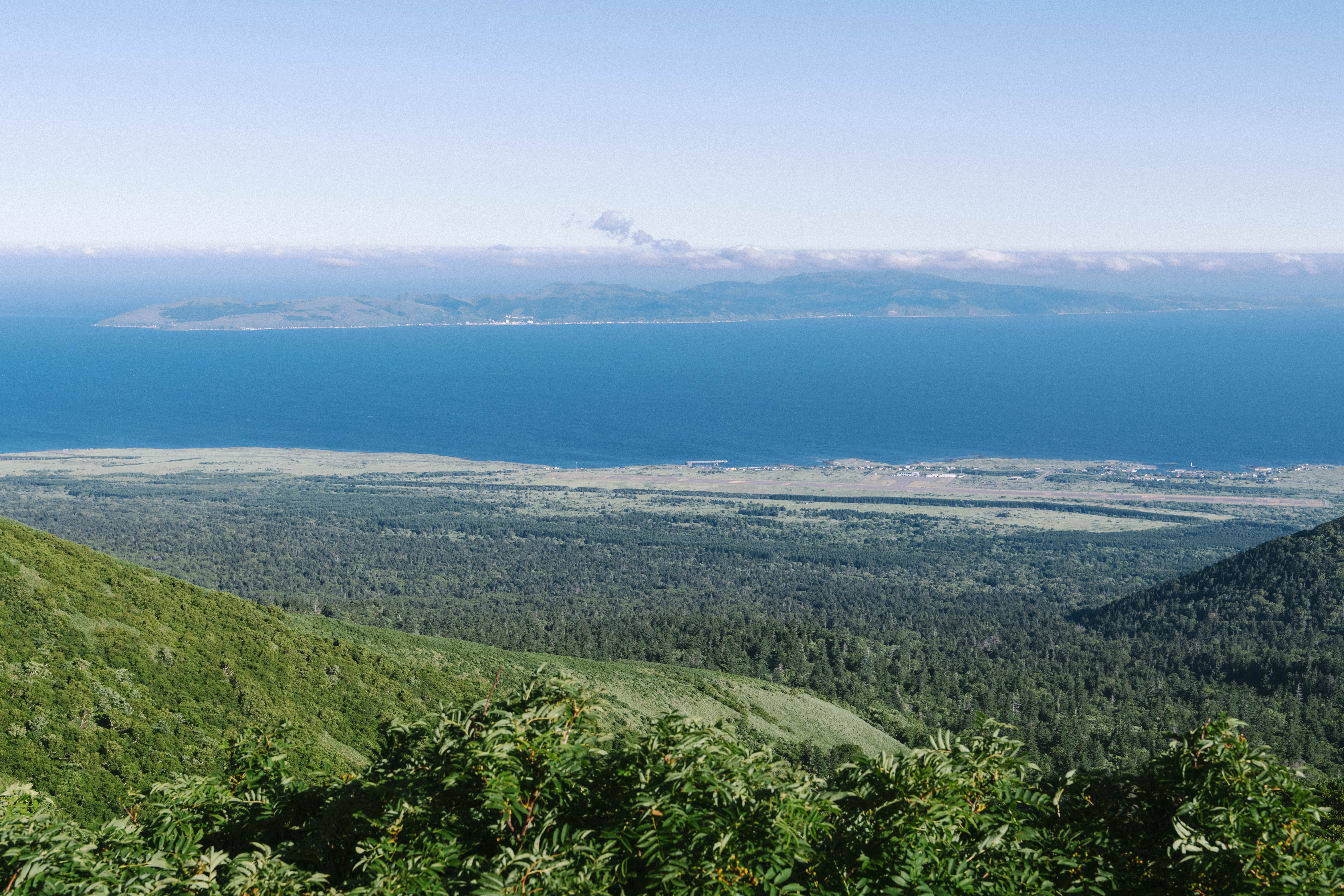 利尻山からすぐそこに見える礼文島の写真素材です。利尻岳は日本百名山の一つであり、高い位置から眼下に広がる緑色の森林と海岸線、遠くに位置する礼文島がはっきりと見えています。登山やトレッキング、北海道の観光情報などにおすすめです。
