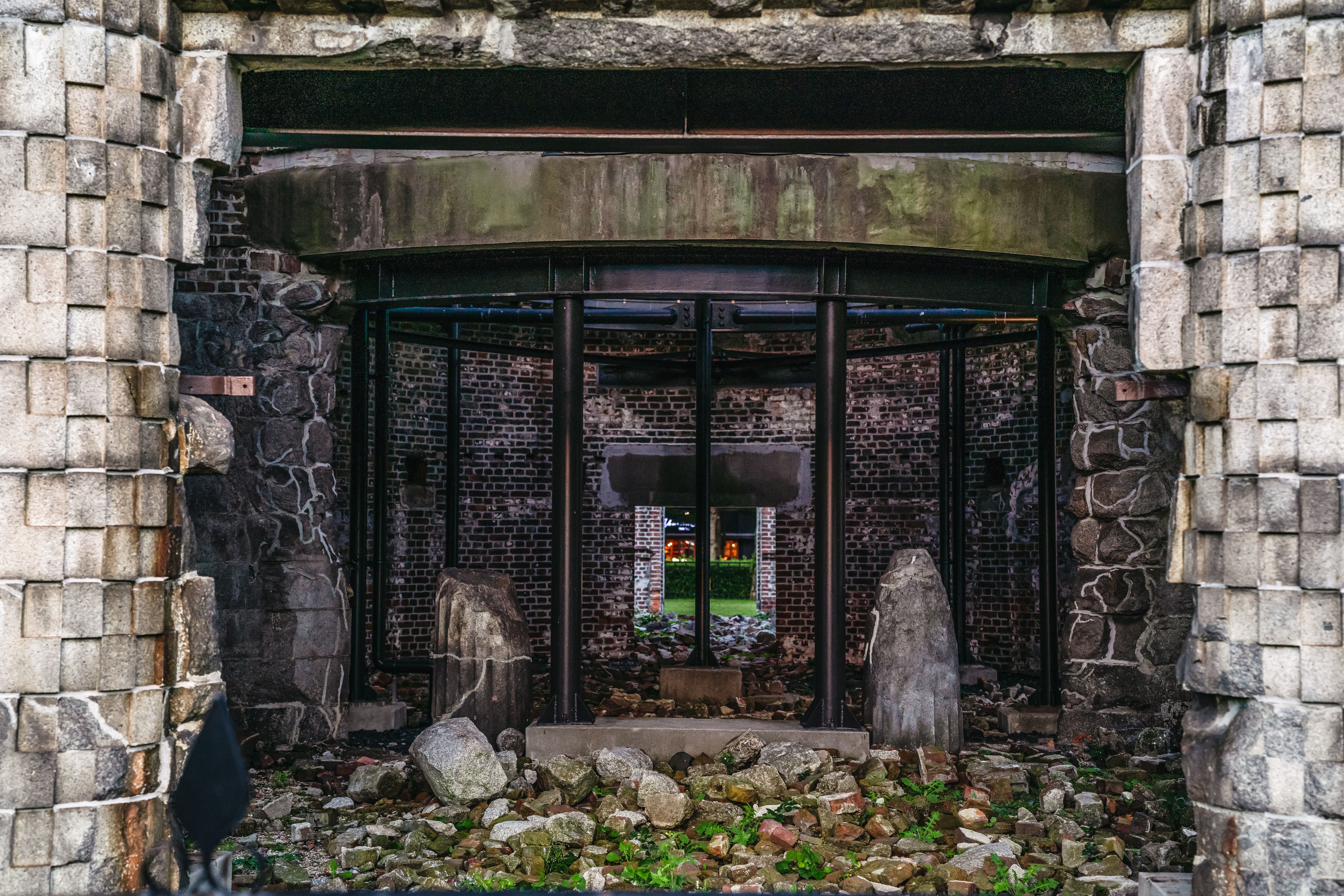 原爆ドームの出入口の写真素材です。花崗岩の角柱で囲まれた開口部の奥に苔が生した褐色のレンガ壁が見え、手前には破損した石や瓦礫が散乱し、広島の被爆の痕跡を今に伝えています。戦争や平和学習、歴史関連のコンテンツ制作などにおすすめです。