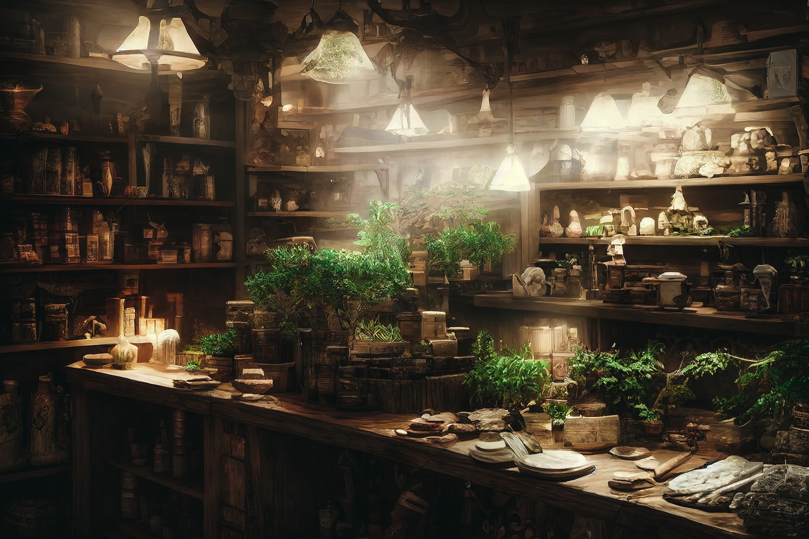 AIで生成した魔法のハーバルショップ風の作業場の画像素材です。木製の棚には薬草が詰まった瓶や調合の道具が並び、テーブルには生きた植物やランプが配置されてファンタジー世界の雰囲気を表現しています。RPGゲームの背景素材やファンタジー系コンテンツの制作に活用できます。