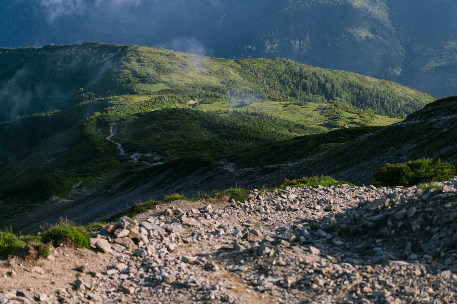 薬師岳の登山道から太郎平方面の山並みを見下ろした写真素材です。手前は礫混じりの登山道、左手には蛇行した渓流が流れ、中景は緑の草原と針葉樹林に覆われた山肌が連なり、奥には青白い雲がかかった峰々が重なっています。登山ガイドや旅行ブログ、アウトドア雑誌、山岳写真のストック素材などにおすすめです。